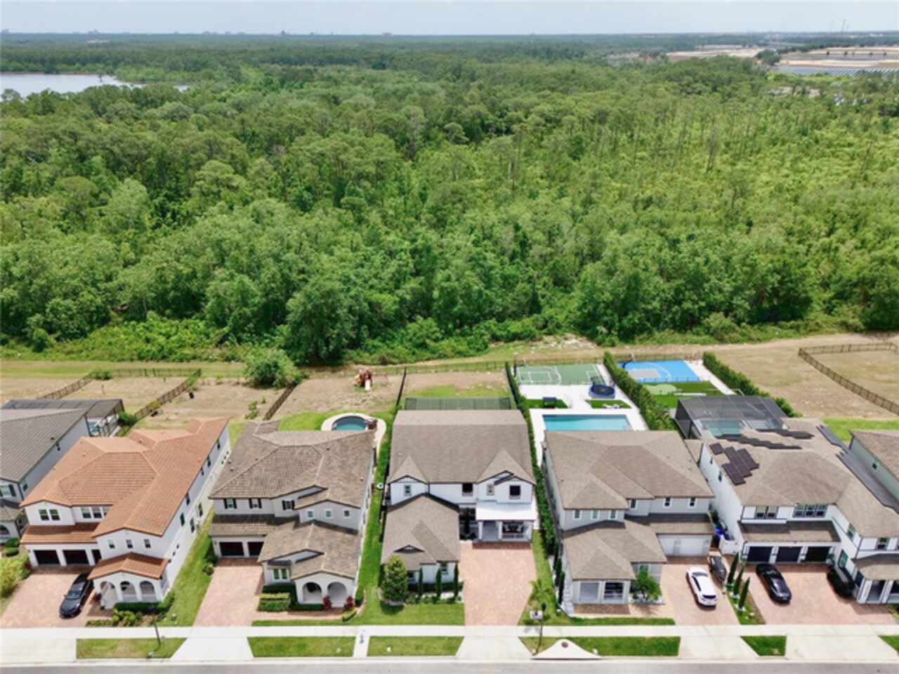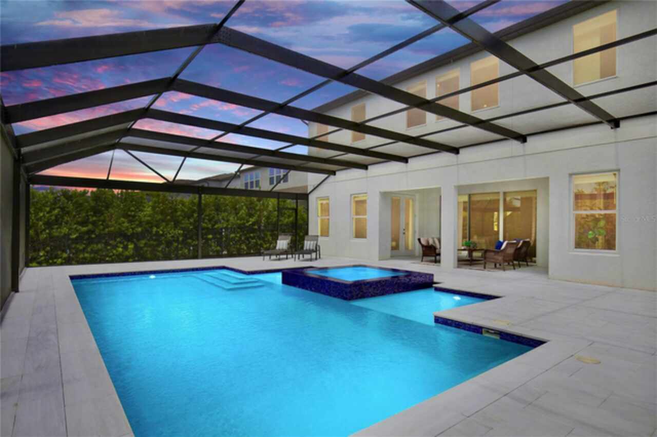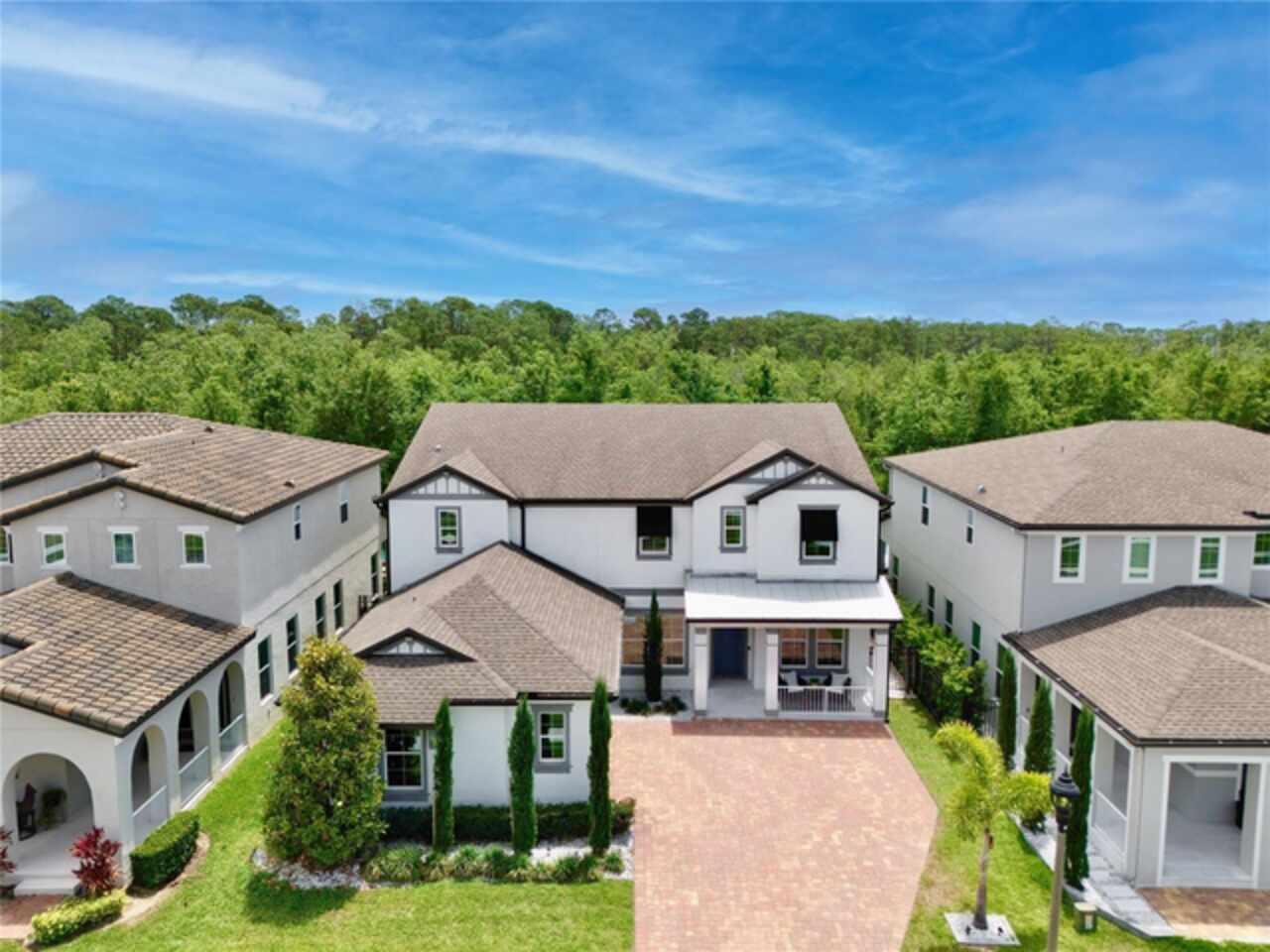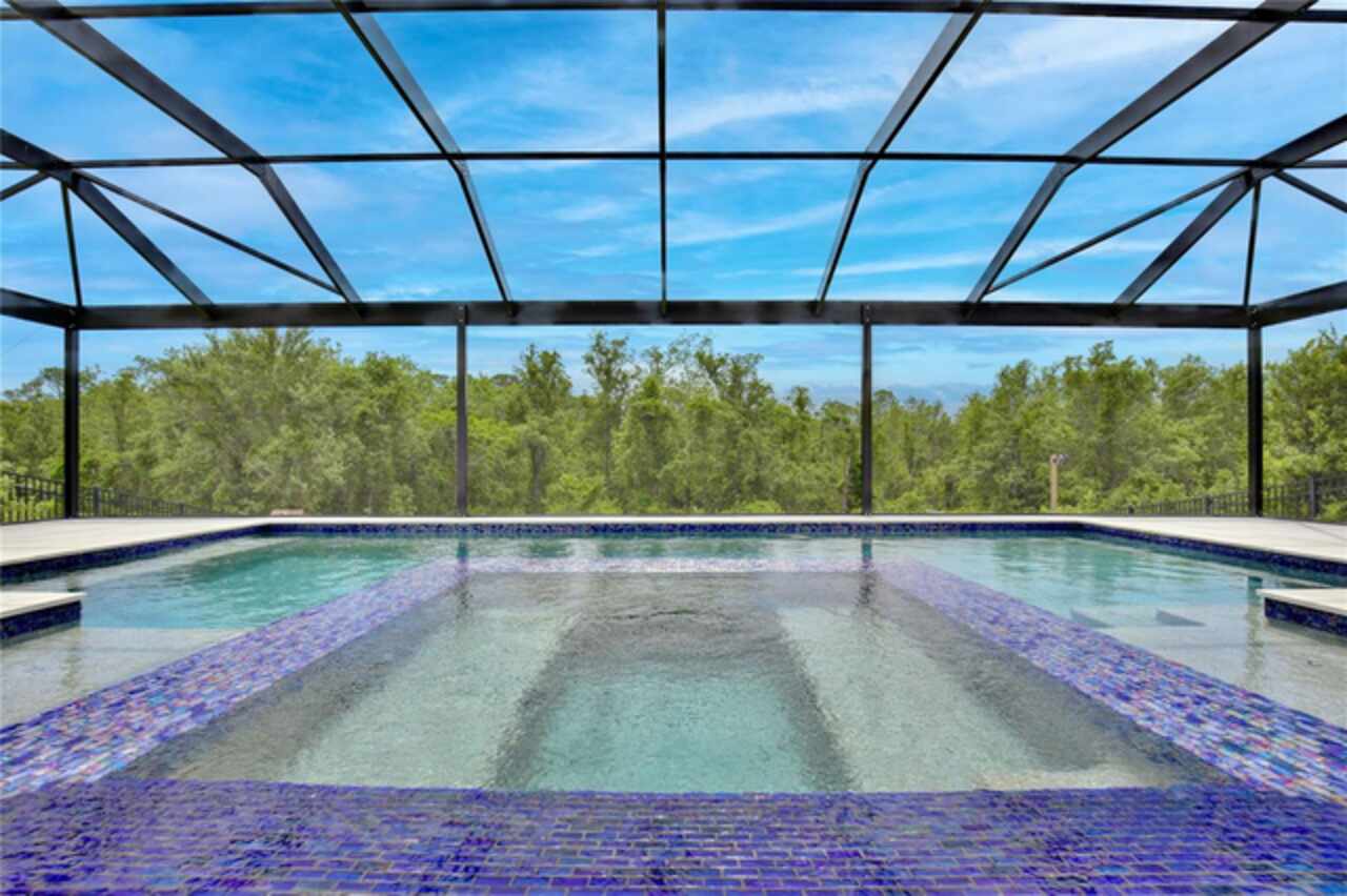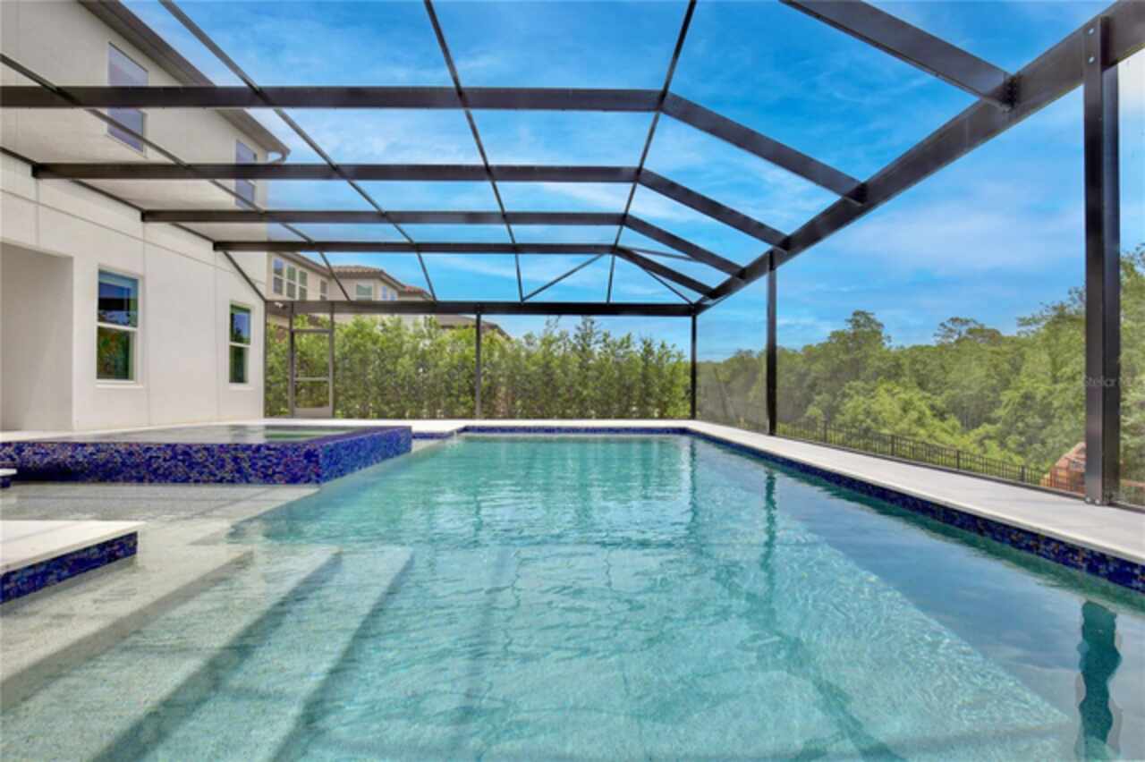 Welcome to 10139 Austrina Oak Loop! Featuring SIX BEDROOMS PLUS OFFICE and FIVE FULL BATHS, on a premium one-third acre lot overlooking the Disney preserve with a HEATED SALTWATER POOL AND SPA under a screen enclosure, this beautifully upgraded home is 4, 500 square feet of understated elegance. With no front neighbor, step back to take in the impressive façade, paver drive and custom landscaping. Across the foyer from the formal dining room, French doors lead to the private office / seventh bedroom with an adjoining full bath. The gourmet kitchen and butler’s pantry feature quartz countertops, stainless appliances including double ovens, 42-inch cabinets with bonus overhead cabinets, an oversized island, and a walk-in pantry, all under the glow of custom light fixtures. A triple-pane sliding door with motorized blinds overlooks the pool and illuminates the family room, with ten-foot ceilings and luxury vinyl plank floor. Around the corner is the first floor Owner’s Suite, with tray ceiling and separate pool access, plus a large Owner’s Bath with two quartz vanities, soaking tub with separate shower and a huge walk-in closet. Upstairs, a wet bar with granite counter opens into a spacious loft with separate bonus room, adjacent to an en suite bedroom with full bath and walk-in closet. A tour of the large secondary bedrooms reveals plentiful natural light, walk-in closets, and views of the pool and wooded area beyond. Outside, a paver deck surrounds the heated saltwater pool and spa – all enclosed in an oversized screen enclosure offering uninterrupted views of nature by day and Disney fireworks by night. This immaculately maintained is completely move-in ready with custom window treatments, fully fenced lot, rain gutters and much more. This home is walking distance to top rated schools, retail, and dining at The Mark, and offers easy access to area attractions and the FL-429 corridor. Contact us now to schedule a private showing of this beautiful home!
