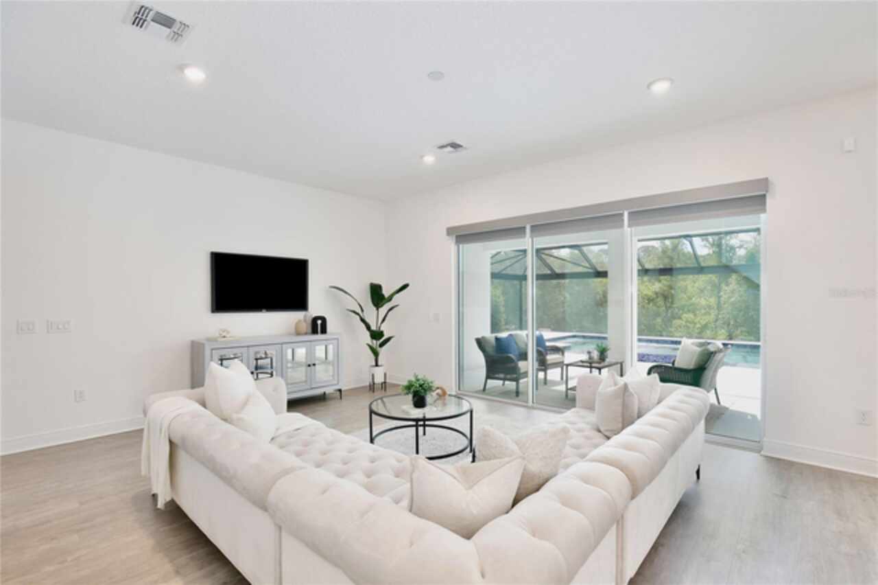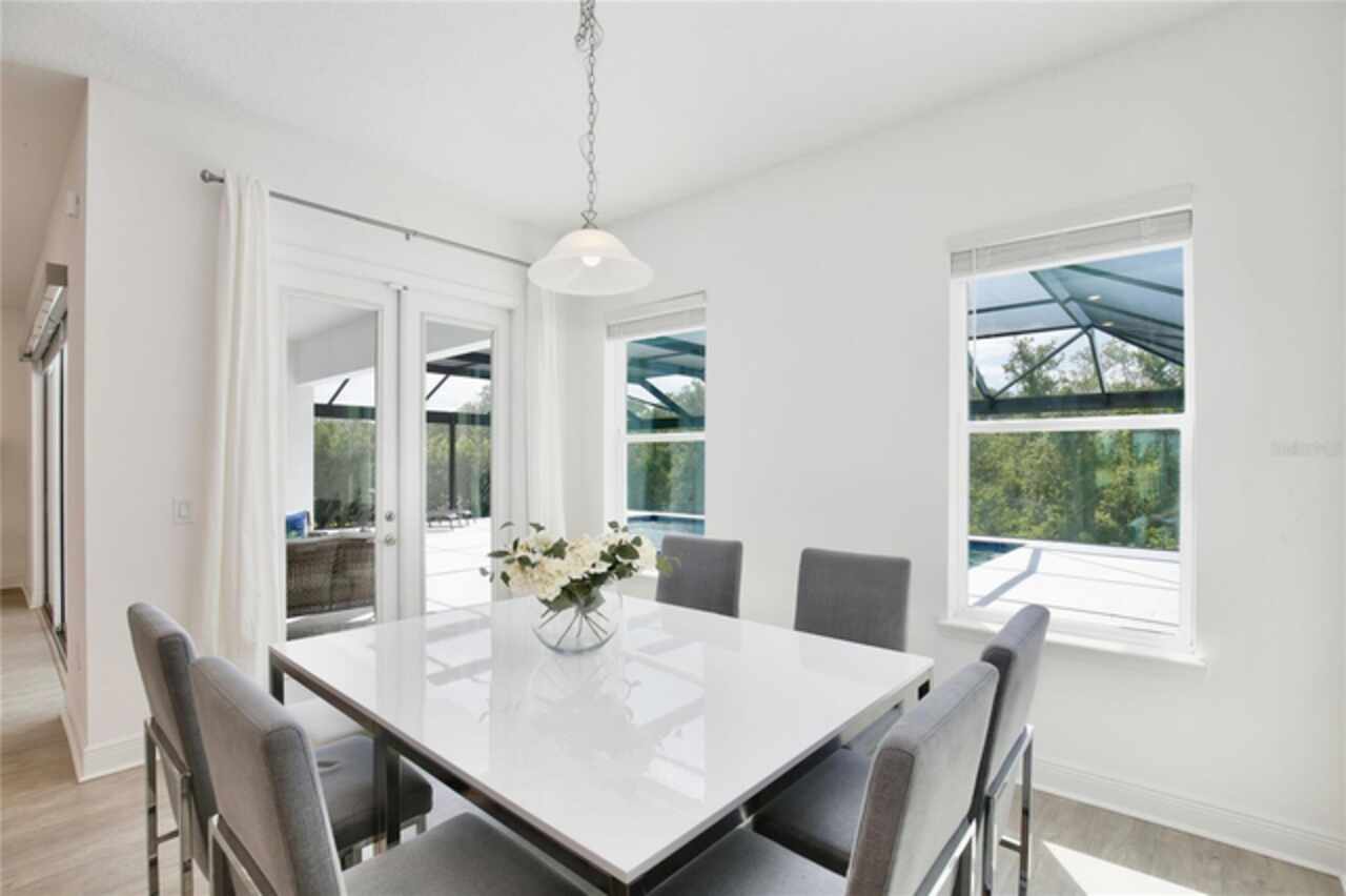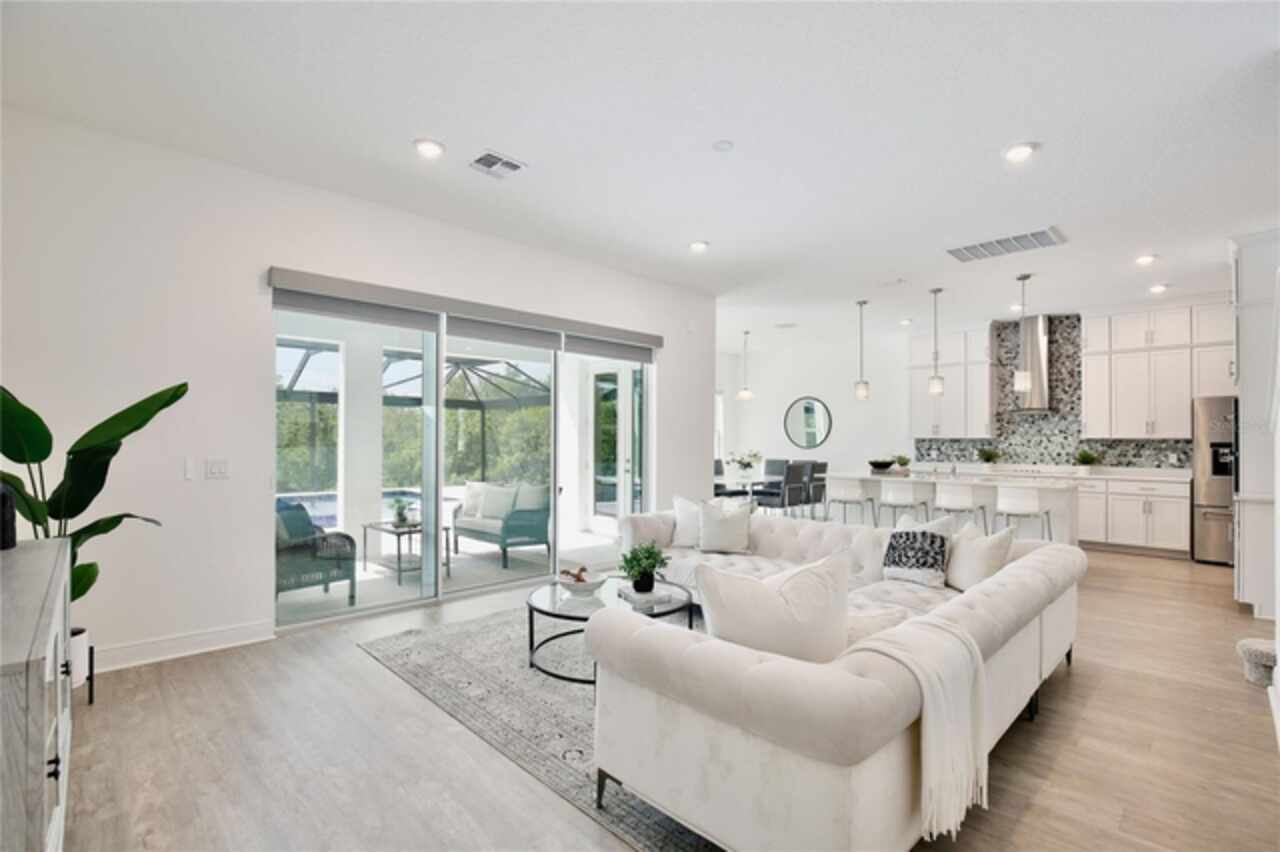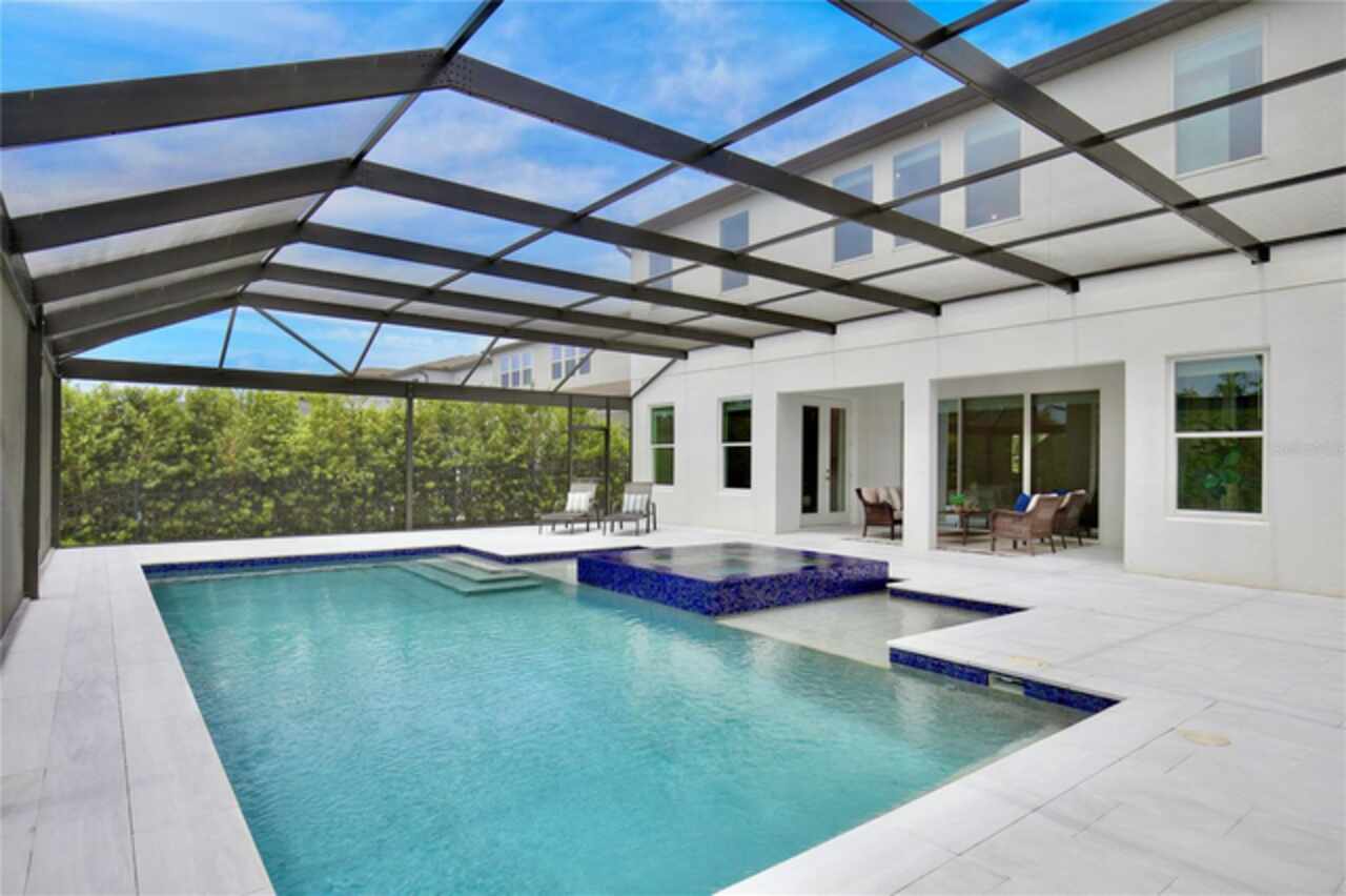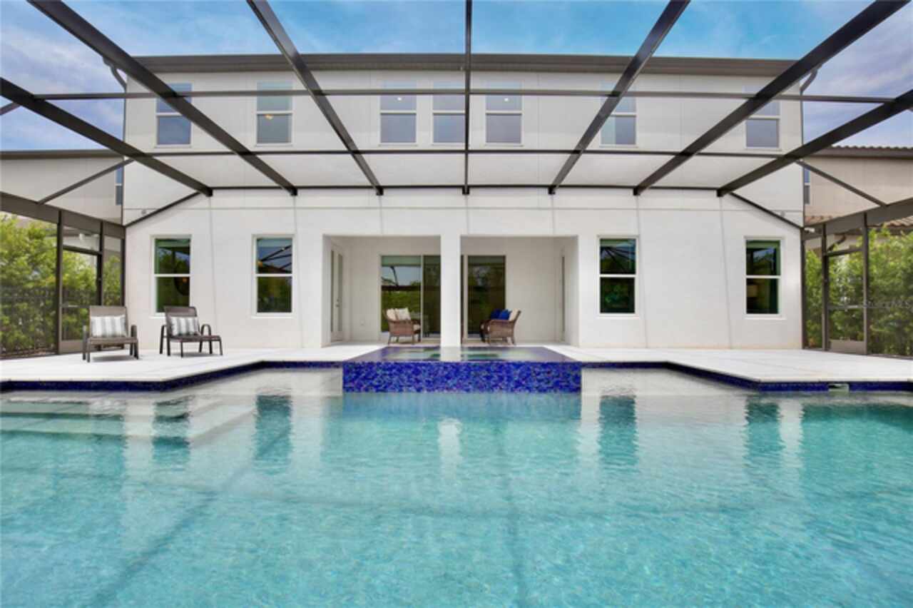 Welcome to 10139 Austrina Oak Loop! Featuring SIX BEDROOMS PLUS OFFICE and FIVE FULL BATHS, on a premium one-third acre lot overlooking the Disney preserve with a HEATED SALTWATER POOL AND SPA under a screen enclosure, this beautifully upgraded home is 4, 500 square feet of understated elegance. With no front neighbor, step back to take in the impressive façade, paver drive and custom landscaping. Across the foyer from the formal dining room, French doors lead to the private office / seventh bedroom with an adjoining full bath. The gourmet kitchen and butler’s pantry feature quartz countertops, stainless appliances including double ovens, 42-inch cabinets with bonus overhead cabinets, an oversized island, and a walk-in pantry, all under the glow of custom light fixtures. A triple-pane sliding door with motorized blinds overlooks the pool and illuminates the family room, with ten-foot ceilings and luxury vinyl plank floor. Around the corner is the first floor Owner’s Suite, with tray ceiling and separate pool access, plus a large Owner’s Bath with two quartz vanities, soaking tub with separate shower and a huge walk-in closet. Upstairs, a wet bar with granite counter opens into a spacious loft with separate bonus room, adjacent to an en suite bedroom with full bath and walk-in closet. A tour of the large secondary bedrooms reveals plentiful natural light, walk-in closets, and views of the pool and wooded area beyond. Outside, a paver deck surrounds the heated saltwater pool and spa – all enclosed in an oversized screen enclosure offering uninterrupted views of nature by day and Disney fireworks by night. This immaculately maintained is completely move-in ready with custom window treatments, fully fenced lot, rain gutters and much more. This home is walking distance to top rated schools, retail, and dining at The Mark, and offers easy access to area attractions and the FL-429 corridor. Contact us now to schedule a private showing of this beautiful home!