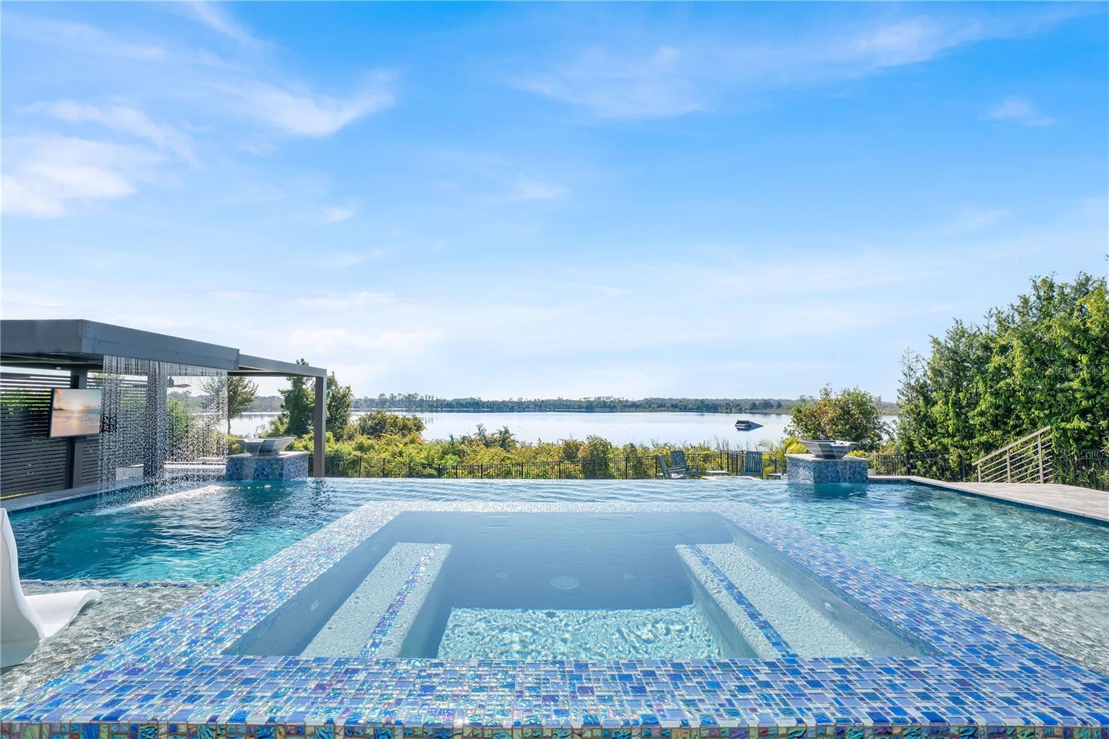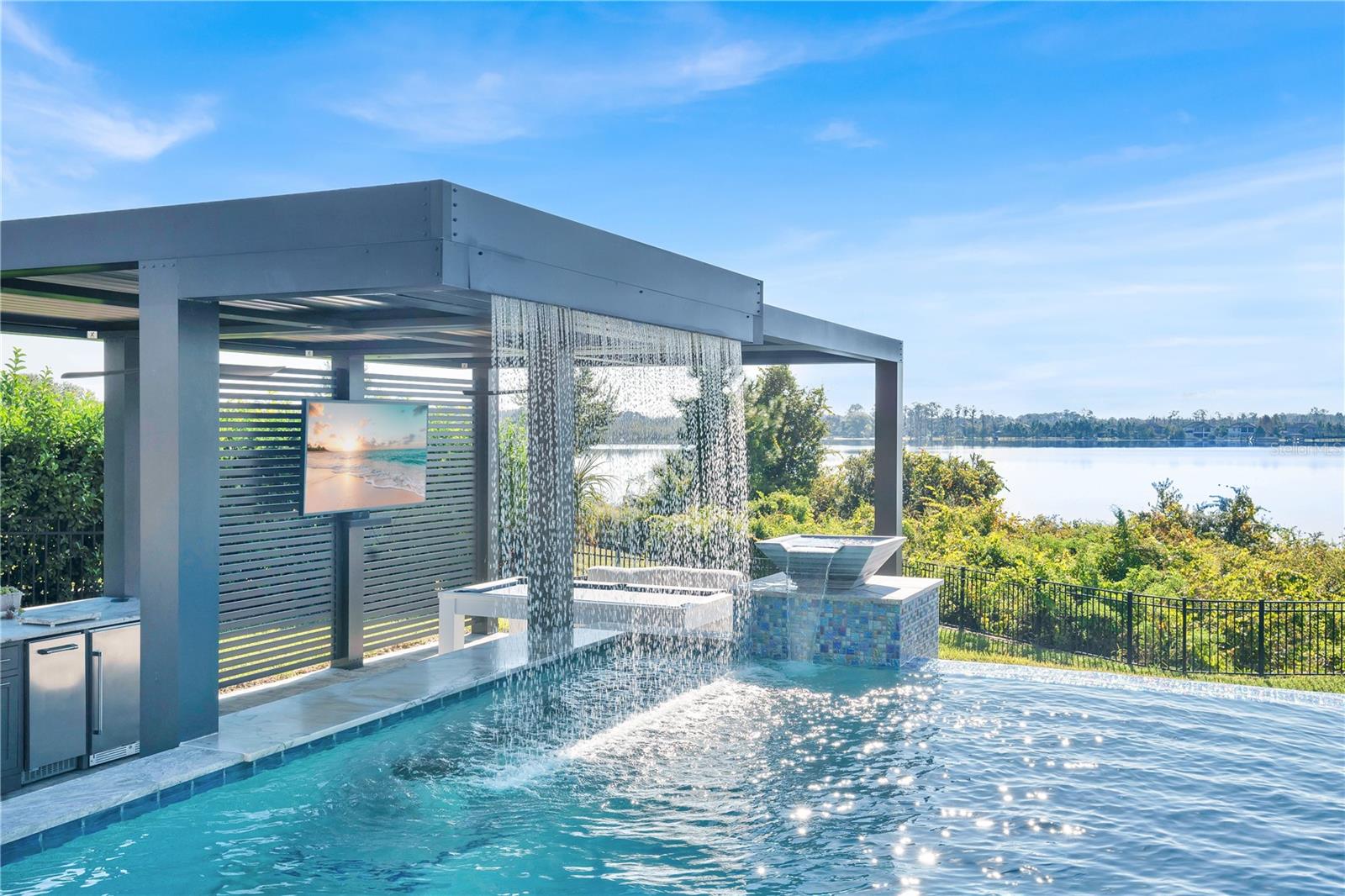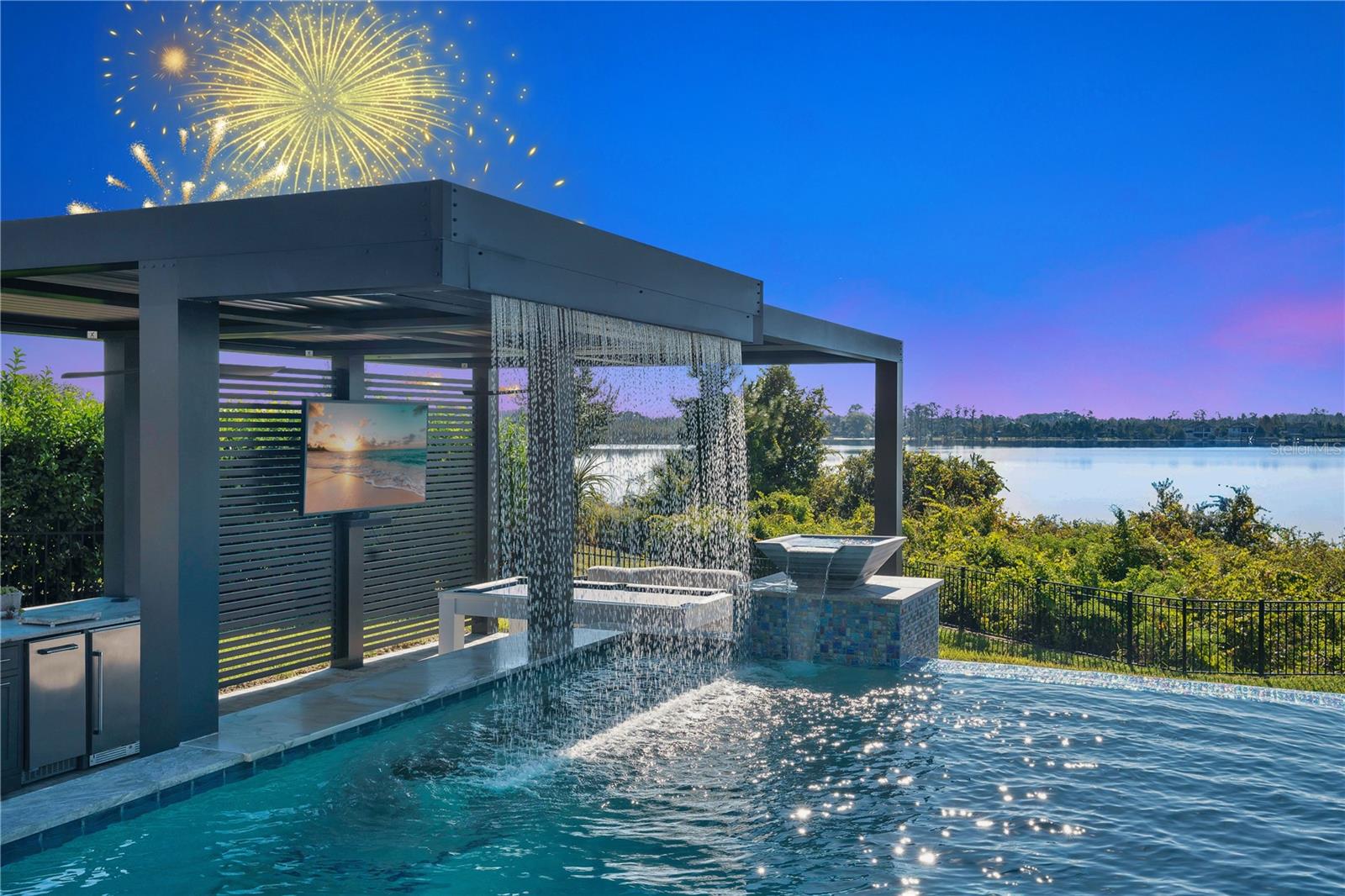 Welcome to this magazine-featured lake-view home in Highlands at Summerlake Groves—celebrated for its incredible outdoor design, regarded among the very best in Winter Garden, where modern style, everyday comfort, and effortless entertaining come together. Step through the front door into a wide-open great room with elegant tile flooring and panoramic views stretching out to the lanai, infinity-edge pool, and tranquil lake beyond. To your left, the gourmet kitchen is designed for both function and flow, showcasing an oversized island, gas cooktop, pot filler, tall cabinetry, soft-close drawers, and a whole-home water filtration system. The kitchen opens seamlessly to the dining and living areas, creating an ideal space for gathering. All four bedrooms include custom-designed closets, while the primary suite offers direct lake views, a generous walk-in closet, and a spa-style bath with dual vanities and frameless glass shower. The 4BR/3.5BA split floor plan provides privacy and flexibility for everyday living or hosting. Step outside to the true showpiece: a covered lanai with motorized shades, full summer kitchen, built-in grill, and bar, all overlooking the resort-style backyard. A sleek pergola adds architectural style while the rain-style waterfall feature flows toward the infinity-edge pool, complemented by a summer kitchen extension and pool bar that make outdoor entertaining effortless. A private basketball court sits to the side of the fully fenced 0.36-acre homesite, framed by a Podocarpus privacy hedge and decorative fencing for a lush, secluded retreat. From your firepit, savor the beautiful sunsets over the lake and, as night falls, enjoy the distant sparkle of theme park fireworks across the water. Additional highlights include a three-car garage and access to resort-style community amenities—walking paths, green spaces, pool, playground, and courts. This residence has been featured in Staycation Magazine and Winter Garden City Lifestyle for its curated design and outdoor lifestyle appeal. A 3D virtual tour and floor plan are available.
