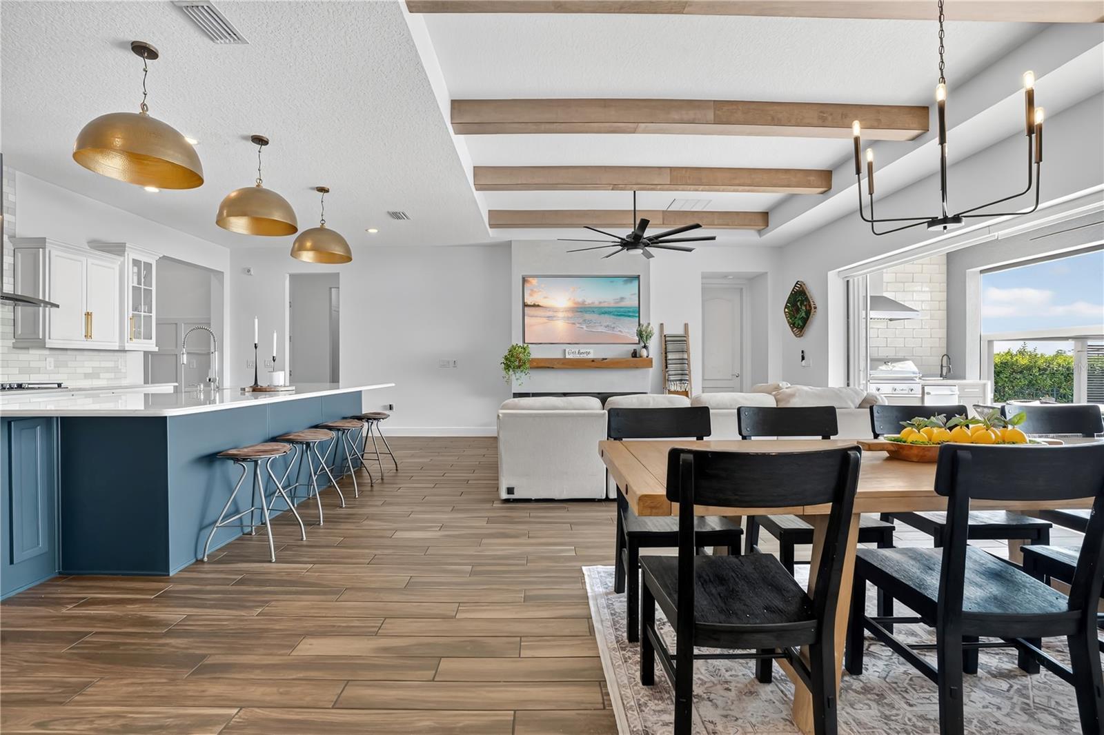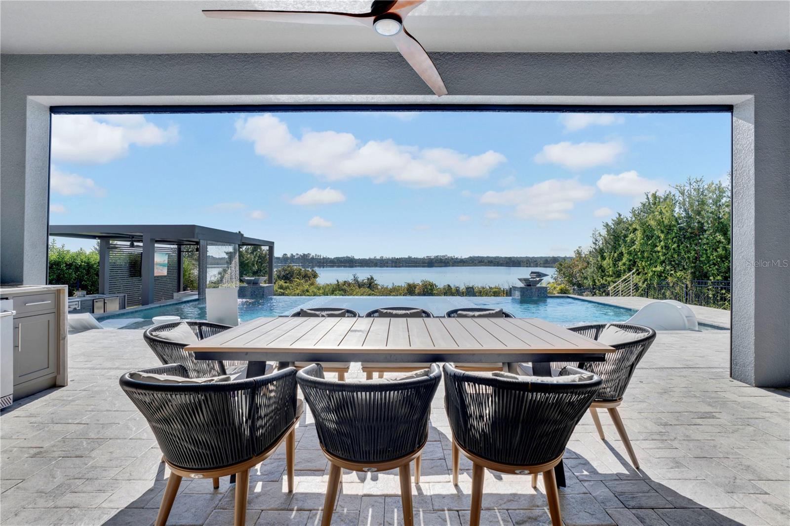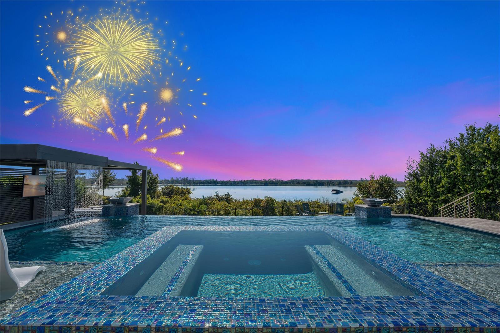 Welcome to this magazine-featured lake-view home in Highlands at Summerlake Groves—celebrated for its incredible outdoor design, regarded among the very best in Winter Garden, where modern style, everyday comfort, and effortless entertaining come together. Step through the front door into a wide-open great room with elegant tile flooring and panoramic views stretching out to the lanai, infinity-edge pool, and tranquil lake beyond. To your left, the gourmet kitchen is designed for both function and flow, showcasing an oversized island, gas cooktop, pot filler, tall cabinetry, soft-close drawers, and a whole-home water filtration system. The kitchen opens seamlessly to the dining and living areas, creating an ideal space for gathering. All four bedrooms include custom-designed closets, while the primary suite offers direct lake views, a generous walk-in closet, and a spa-style bath with dual vanities and frameless glass shower. The 4BR/3.5BA split floor plan provides privacy and flexibility for everyday living or hosting. Step outside to the true showpiece: a covered lanai with motorized shades, full summer kitchen, built-in grill, and bar, all overlooking the resort-style backyard. A sleek pergola adds architectural style while the rain-style waterfall feature flows toward the infinity-edge pool, complemented by a summer kitchen extension and pool bar that make outdoor entertaining effortless. A private basketball court sits to the side of the fully fenced 0.36-acre homesite, framed by a Podocarpus privacy hedge and decorative fencing for a lush, secluded retreat. From your firepit, savor the beautiful sunsets over the lake and, as night falls, enjoy the distant sparkle of theme park fireworks across the water. Additional highlights include a three-car garage and access to resort-style community amenities—walking paths, green spaces, pool, playground, and courts. This residence has been featured in Staycation Magazine and Winter Garden City Lifestyle for its curated design and outdoor lifestyle appeal. A 3D virtual tour and floor plan are available.