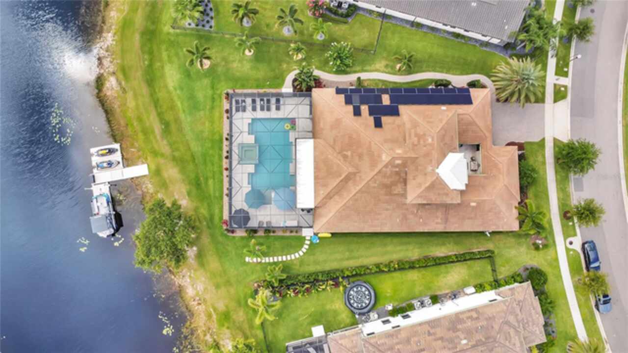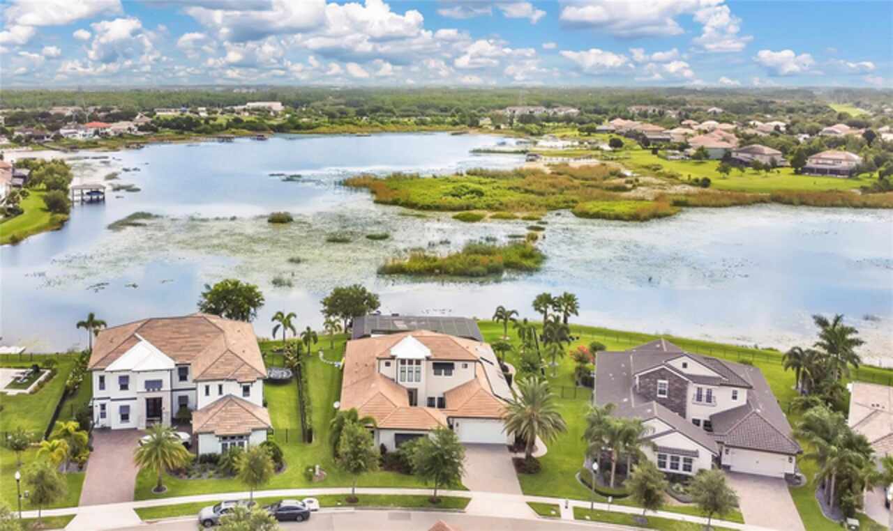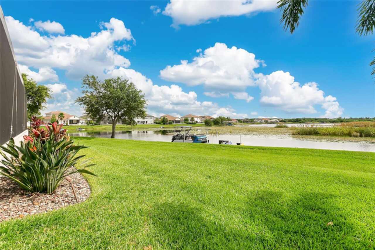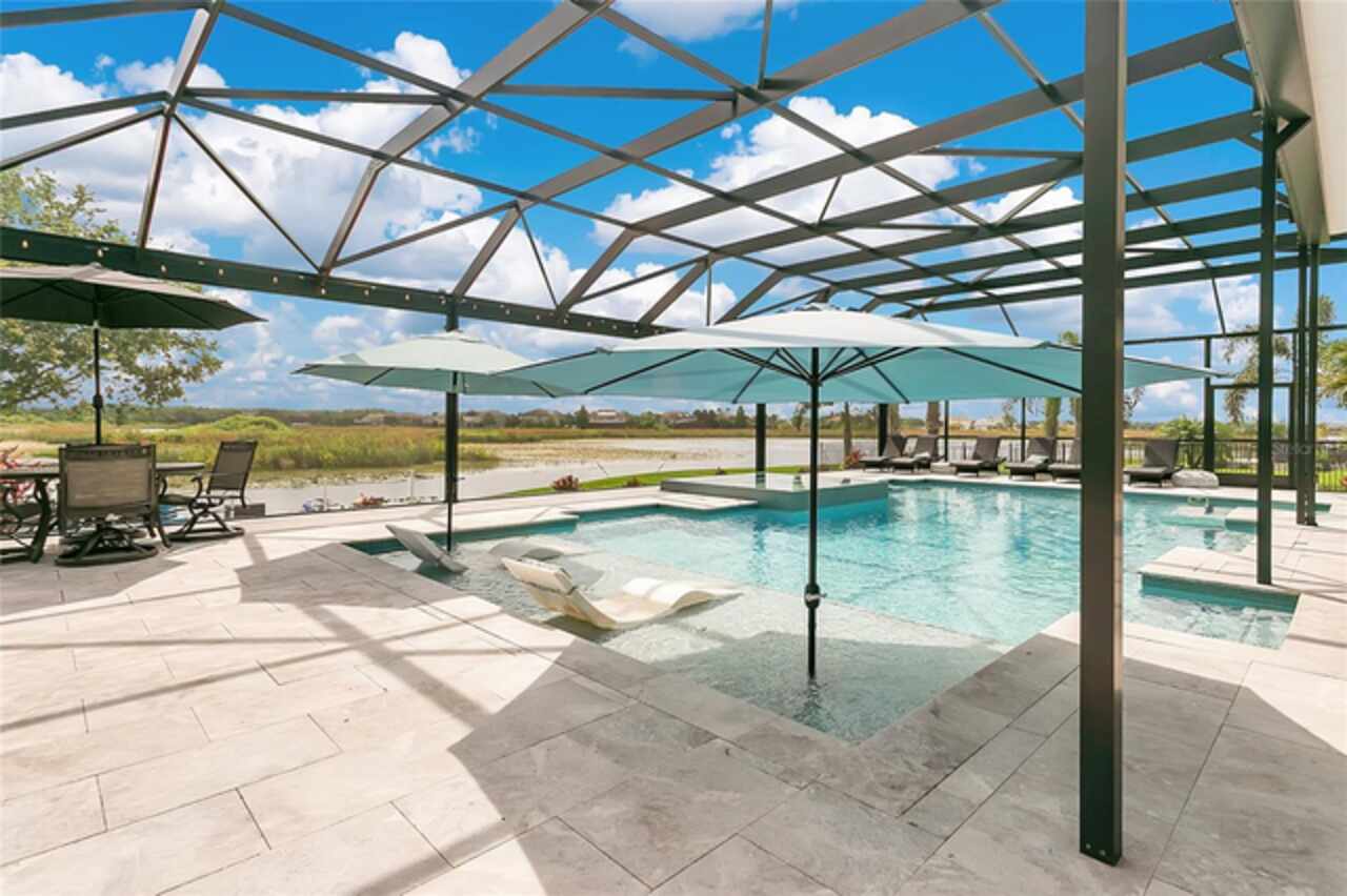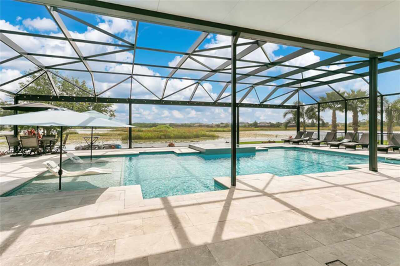 Under contract-accepting backup offers. This home truly has it all. Nestled in The Overlook at Hamlin—one of the most vibrant and sought-after lakefront communities—this custom Taylor Morrison residence combines luxury, energy efficiency, and everyday convenience. Ideally located just minutes from Disney with easy access to Hwy 429, the home offers both lifestyle and location. Set on the scenic shores of Lake Hancock with nightly Disney Firework Displays, the thoughtfully designed floor plan features all main living spaces on the first floor, plus an upstairs media room or optional fifth bedroom with private bath. The primary suite is a tranquil retreat with stunning lake views and a spa-inspired bath. High ceilings with crown molding and wood beams, abundant natural light, and a stacked stone fireplace create a warm, inviting atmosphere. Gorgeous tile floors flow throughout. The chef’s kitchen impresses with a natural gas cooktop, quartz island, French door oven, and walk-in butler’s pantry. Step outside to your private lakefront oasis—a screened lanai with resort-style saltwater pool and spa, sun shelf with umbrellas, and a summer kitchen plus pizza oven station, perfect for entertaining. Just beyond, a floating dock offers direct lake access. Enjoy low utility costs thanks to a fully paid-off whole-house solar system and a tankless gas water heater—average electric bills are just $78/month. Additional features include a gated front courtyard for added privacy and security, and access to Overlook’s resort-style amenities, including a fitness center, community pool and splash pad, parks, and a private boat ramp for residents. Furnishings may be available.