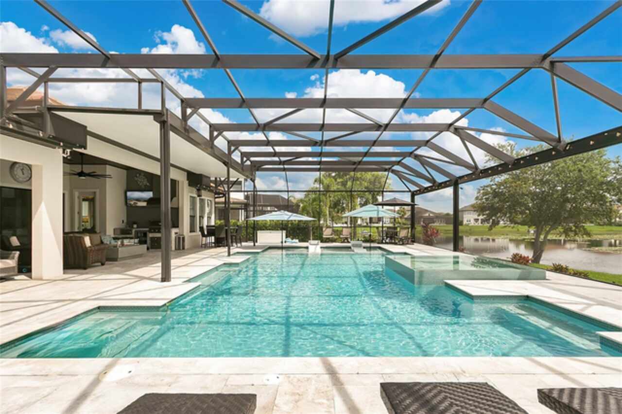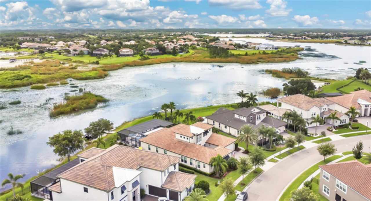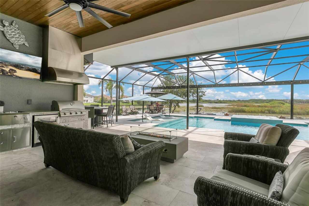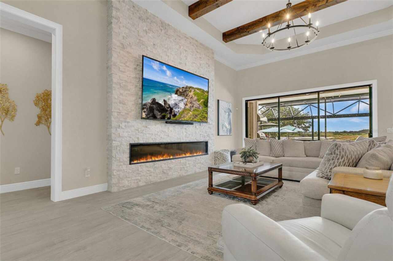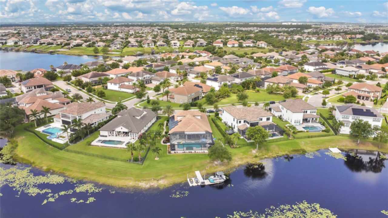 Under contract-accepting backup offers. This home truly has it all. Nestled in The Overlook at Hamlin—one of the most vibrant and sought-after lakefront communities—this custom Taylor Morrison residence combines luxury, energy efficiency, and everyday convenience. Ideally located just minutes from Disney with easy access to Hwy 429, the home offers both lifestyle and location. Set on the scenic shores of Lake Hancock with nightly Disney Firework Displays, the thoughtfully designed floor plan features all main living spaces on the first floor, plus an upstairs media room or optional fifth bedroom with private bath. The primary suite is a tranquil retreat with stunning lake views and a spa-inspired bath. High ceilings with crown molding and wood beams, abundant natural light, and a stacked stone fireplace create a warm, inviting atmosphere. Gorgeous tile floors flow throughout. The chef’s kitchen impresses with a natural gas cooktop, quartz island, French door oven, and walk-in butler’s pantry. Step outside to your private lakefront oasis—a screened lanai with resort-style saltwater pool and spa, sun shelf with umbrellas, and a summer kitchen plus pizza oven station, perfect for entertaining. Just beyond, a floating dock offers direct lake access. Enjoy low utility costs thanks to a fully paid-off whole-house solar system and a tankless gas water heater—average electric bills are just $78/month. Additional features include a gated front courtyard for added privacy and security, and access to Overlook’s resort-style amenities, including a fitness center, community pool and splash pad, parks, and a private boat ramp for residents. Furnishings may be available.