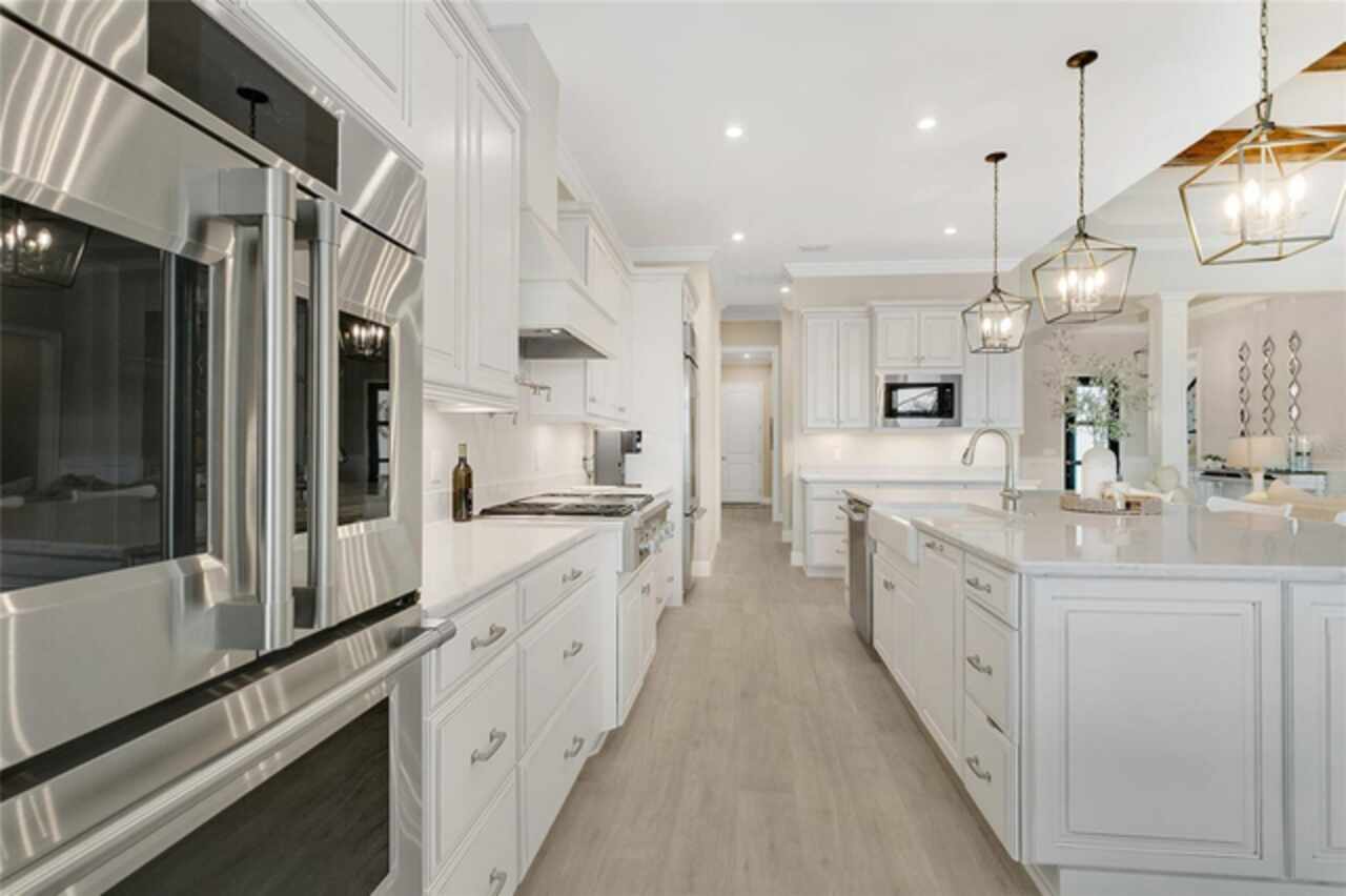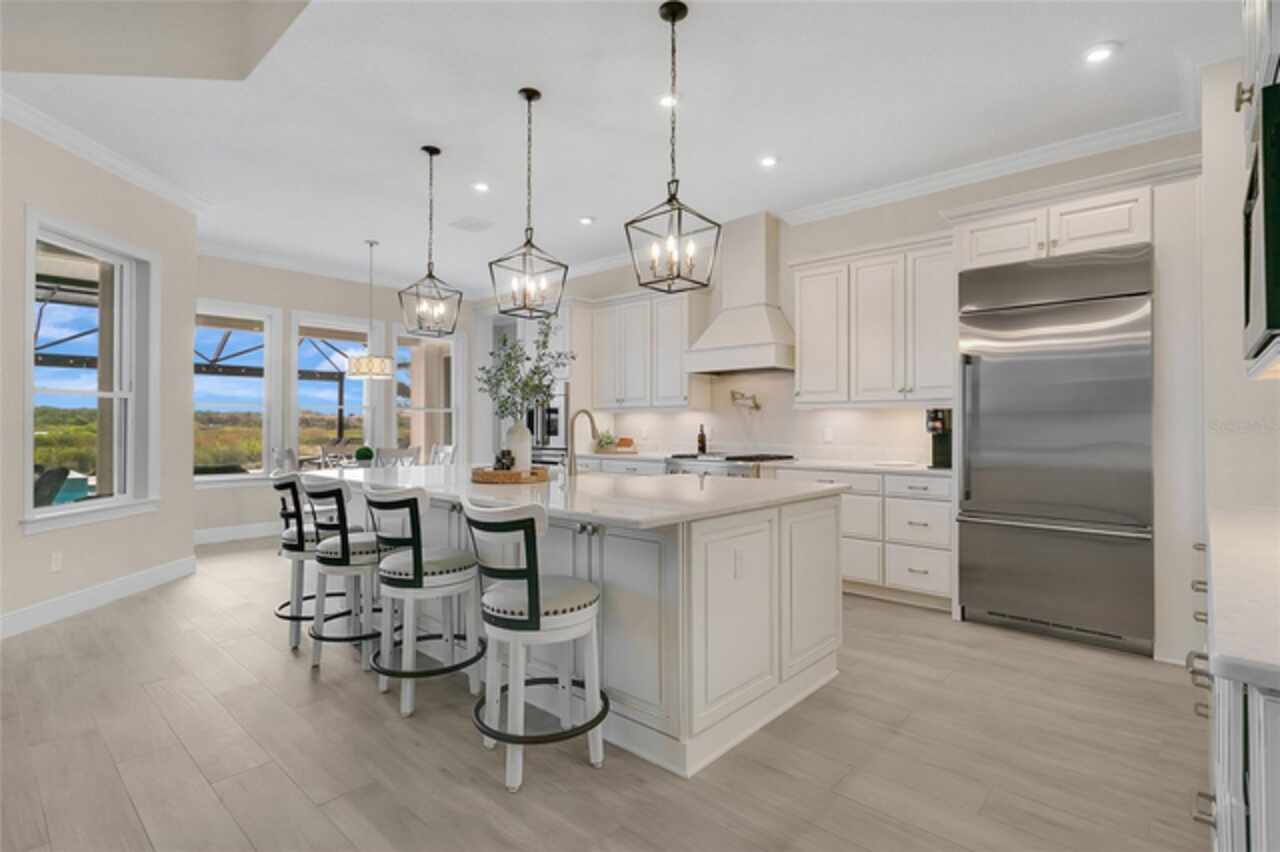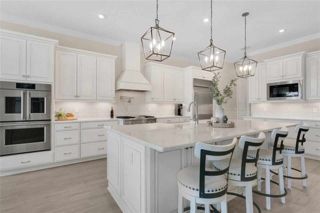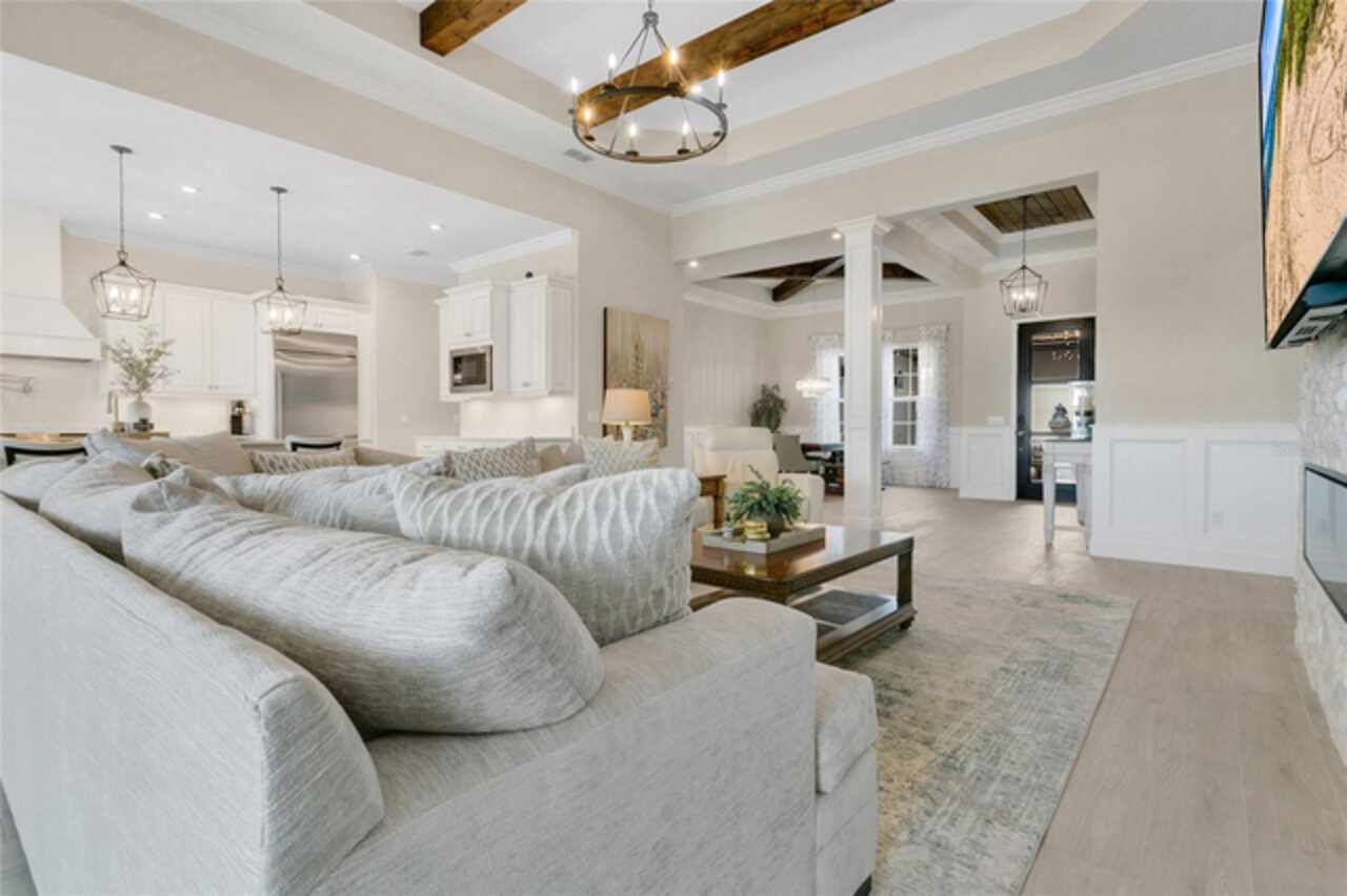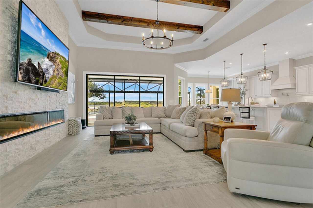 Under contract-accepting backup offers. This home truly has it all. Nestled in The Overlook at Hamlin—one of the most vibrant and sought-after lakefront communities—this custom Taylor Morrison residence combines luxury, energy efficiency, and everyday convenience. Ideally located just minutes from Disney with easy access to Hwy 429, the home offers both lifestyle and location. Set on the scenic shores of Lake Hancock with nightly Disney Firework Displays, the thoughtfully designed floor plan features all main living spaces on the first floor, plus an upstairs media room or optional fifth bedroom with private bath. The primary suite is a tranquil retreat with stunning lake views and a spa-inspired bath. High ceilings with crown molding and wood beams, abundant natural light, and a stacked stone fireplace create a warm, inviting atmosphere. Gorgeous tile floors flow throughout. The chef’s kitchen impresses with a natural gas cooktop, quartz island, French door oven, and walk-in butler’s pantry. Step outside to your private lakefront oasis—a screened lanai with resort-style saltwater pool and spa, sun shelf with umbrellas, and a summer kitchen plus pizza oven station, perfect for entertaining. Just beyond, a floating dock offers direct lake access. Enjoy low utility costs thanks to a fully paid-off whole-house solar system and a tankless gas water heater—average electric bills are just $78/month. Additional features include a gated front courtyard for added privacy and security, and access to Overlook’s resort-style amenities, including a fitness center, community pool and splash pad, parks, and a private boat ramp for residents. Furnishings may be available.