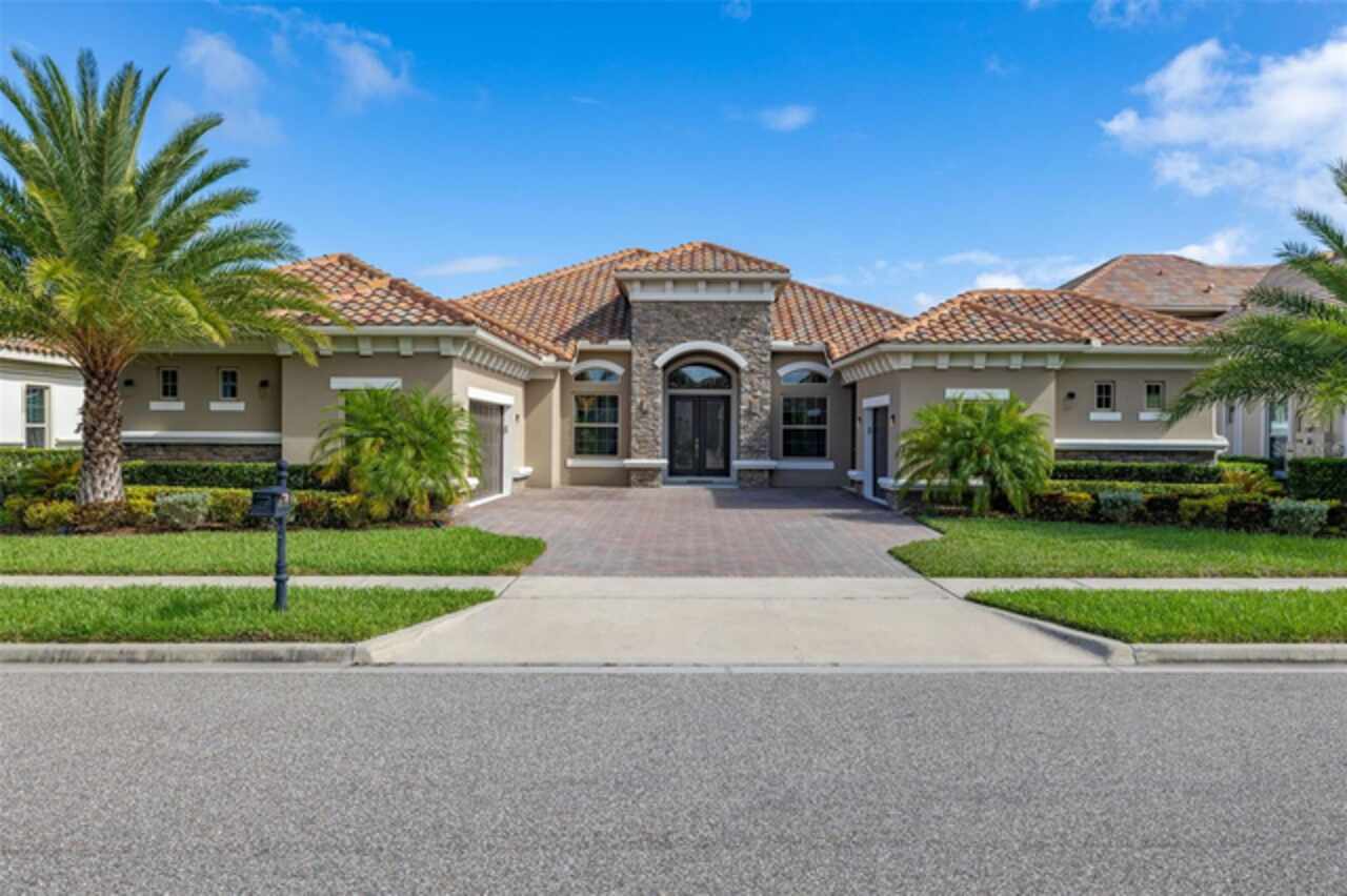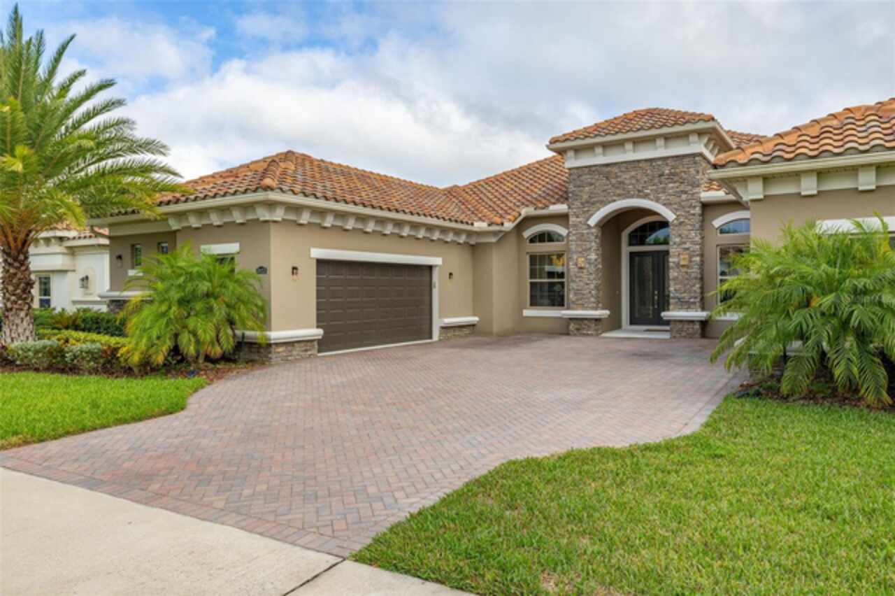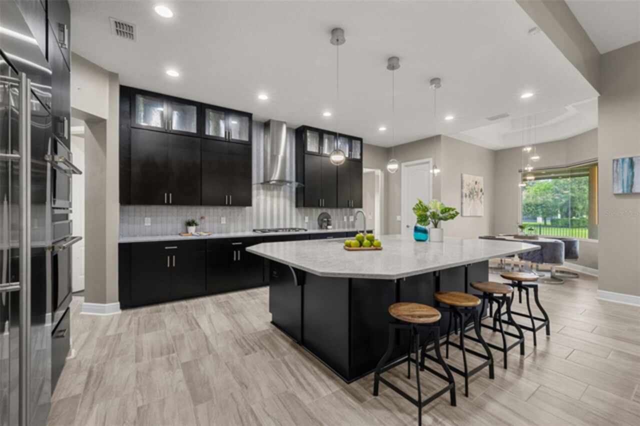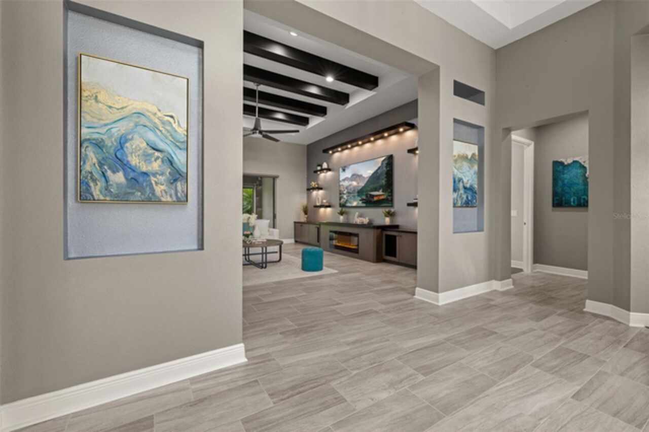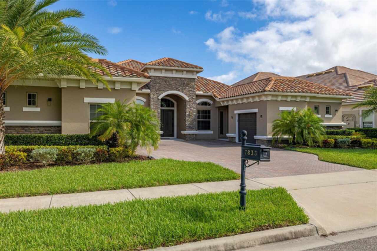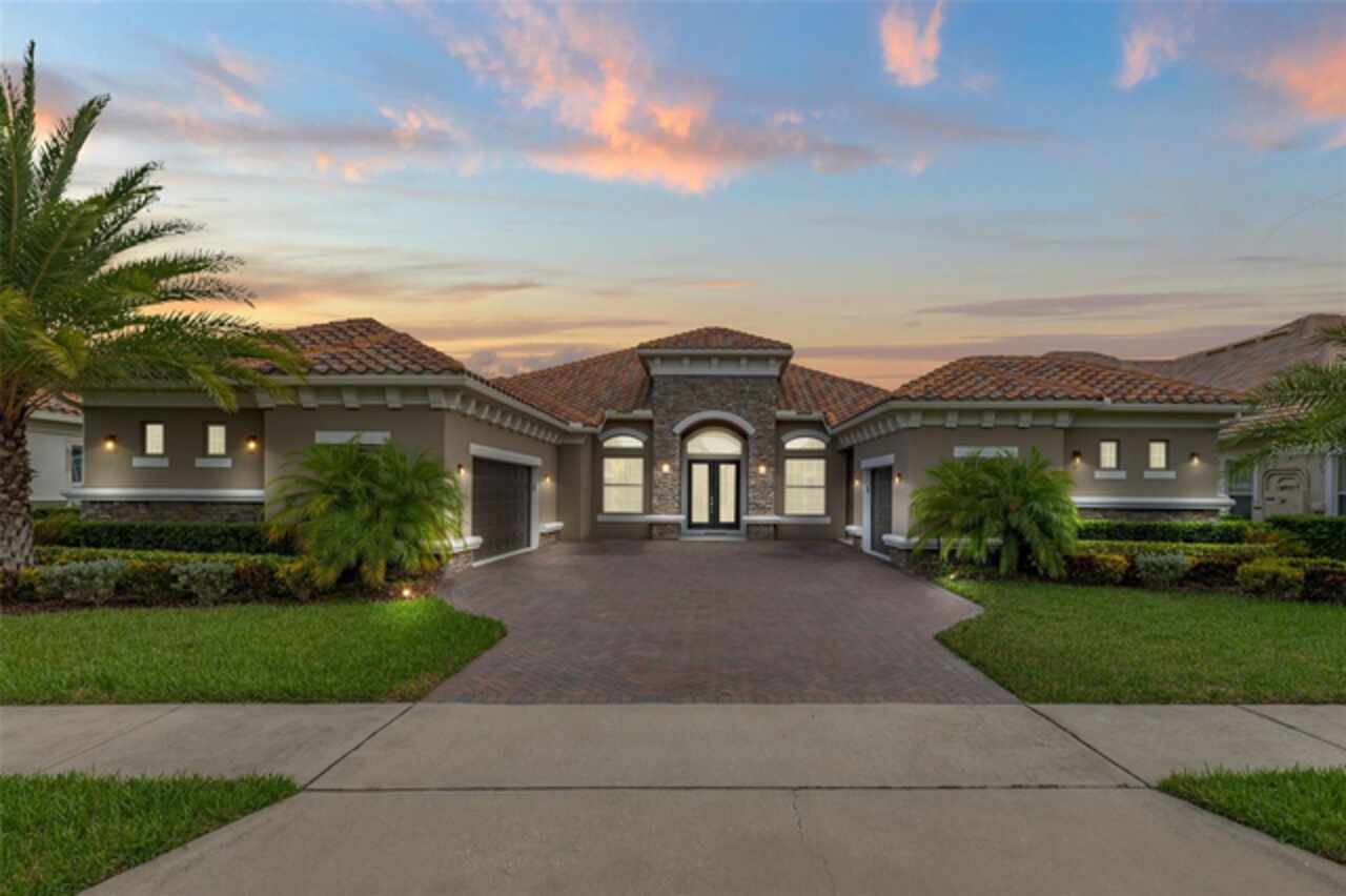 Under contract-accepting backup offers. Welcome to a truly exquisite single-story residence in the coveted and exclusive gated waterfront community of the Isles of Lake Hancock. Step inside to an opulent foyer that opens into a grand, light-filled living space with 14-foot double tray ceilings, engineered hardwood and luxury tile flooring, and expansive windows fitted with remote-controlled blinds. The open layout flows seamlessly through the formal dining room, dedicated office, and spacious living area. The chef’s kitchen is a standout centerpiece, thoughtfully designed with custom cabinetry, premium Monogram stainless steel appliances and an oversized pantry for additional storage. The private primary suite is positioned away from the secondary bedrooms and offers a peaceful retreat with an oversized spa-style bath, a luxurious walk-in shower, and a custom-designed closet. An extended den acts as the perfect reading nook or morning lounge, leading directly to your covered lanai and fenced backyard. Entertain in style with a high-end electric screen enclosure, outdoor heating unit, and custom entertainment cabinetry. The property also features dual garages—a two-car and a single-car—finished with sleek smoke grey epoxy flooring, providing flexible space for parking, a home gym, or elevated storage. The garage is equally impressive, showcasing smoke grey epoxy flooring, car lift capability, and a dedicated space prepped for an in-home golf simulator—perfect for golf enthusiasts. Beyond the home, residents enjoy direct access to two man-made lakes in a nationally recognized water-skiing community, known for hosting world-class tournaments annually. The location also offers close proximity to Walt Disney World, upscale golf courses, premier shopping and dining, and features a community playground, making it ideal for both recreation and family-friendly living. This artistically curated home is more than just a residence, it’s a statement in luxury, design, and lifestyle. Don’t miss your opportunity to own a rare gem in the exclusive community of the Isles of Lake Hancock.