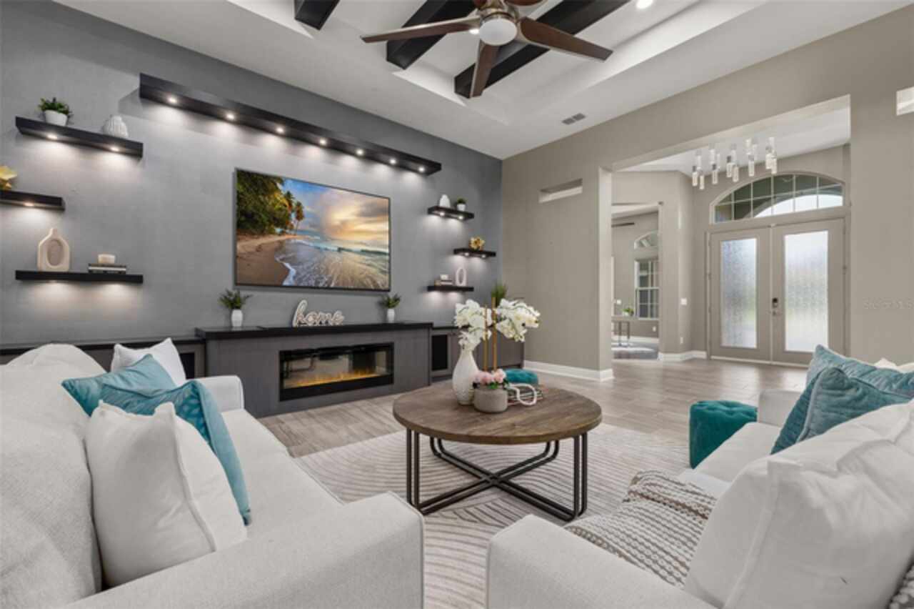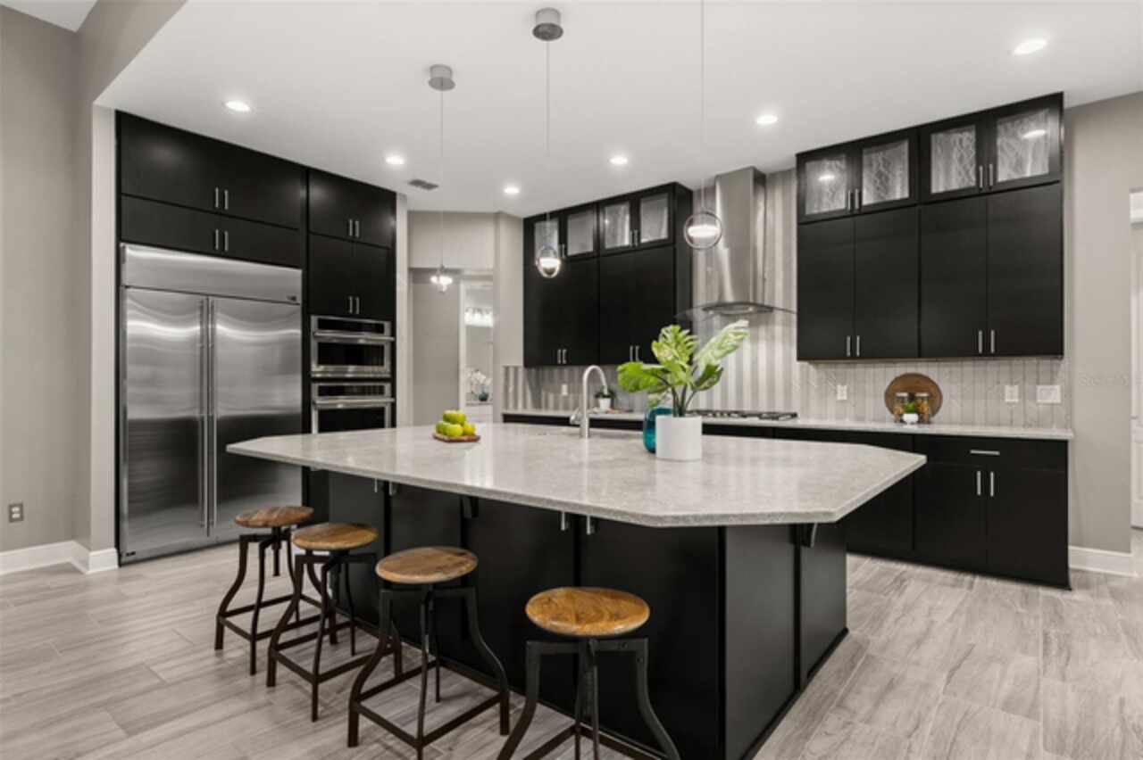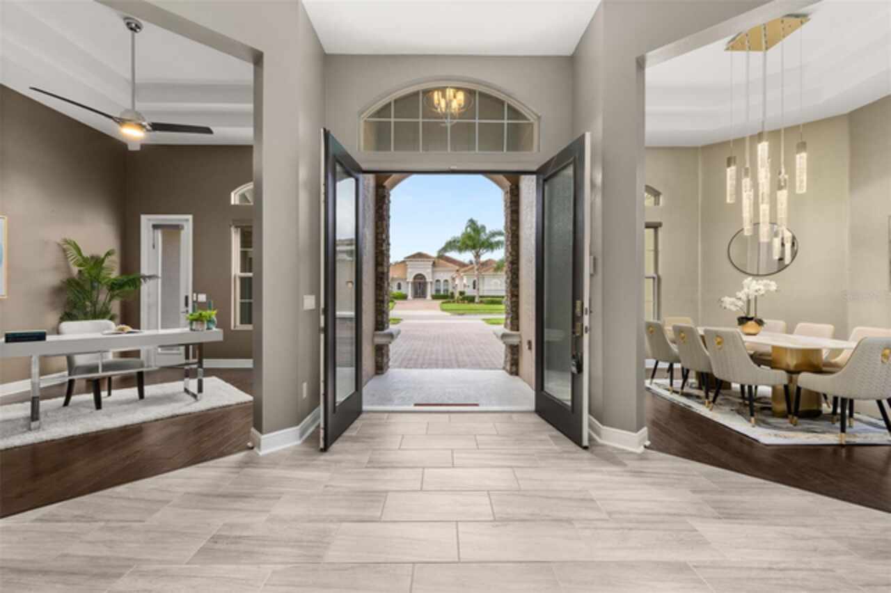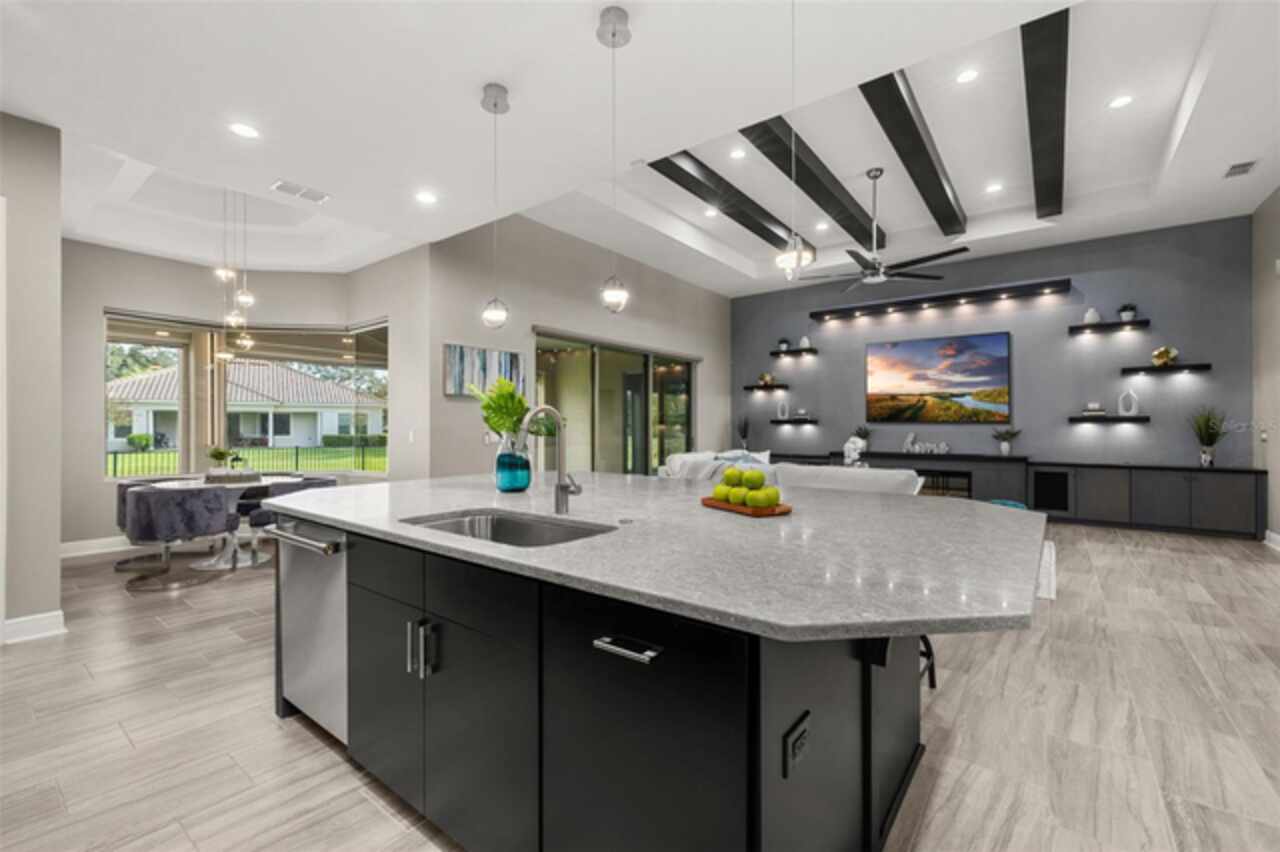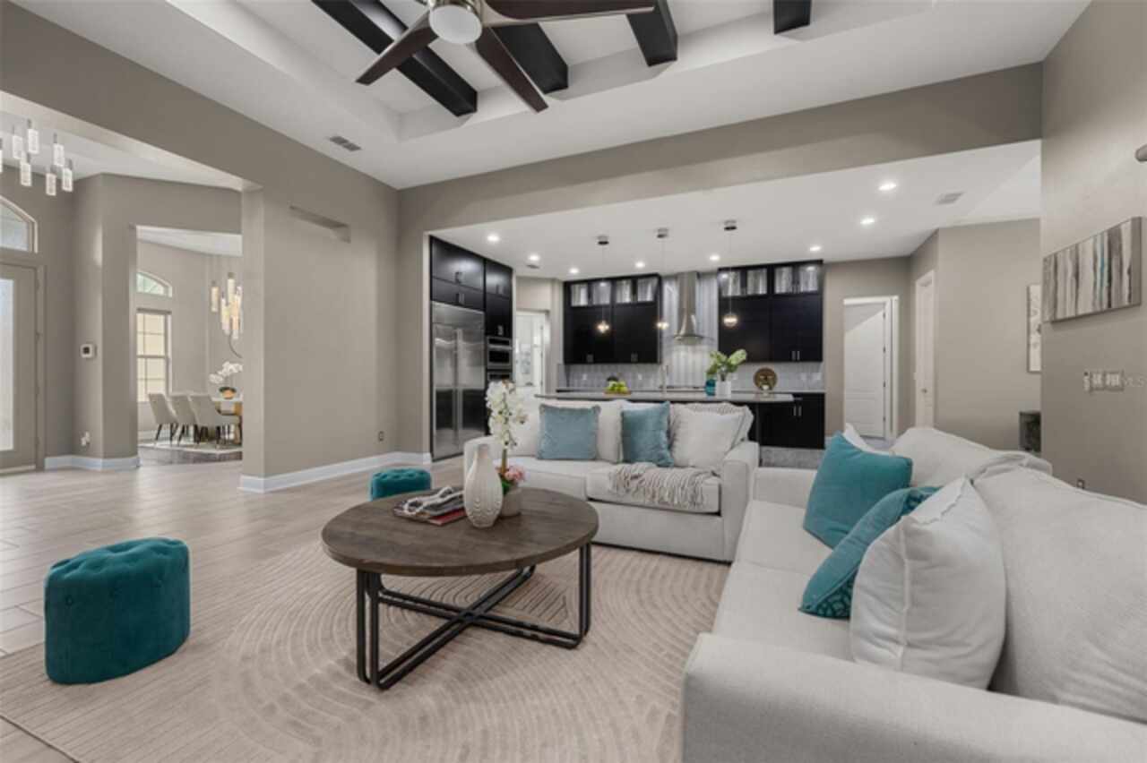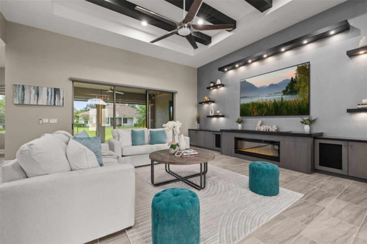 Under contract-accepting backup offers. Welcome to a truly exquisite single-story residence in the coveted and exclusive gated waterfront community of the Isles of Lake Hancock. Step inside to an opulent foyer that opens into a grand, light-filled living space with 14-foot double tray ceilings, engineered hardwood and luxury tile flooring, and expansive windows fitted with remote-controlled blinds. The open layout flows seamlessly through the formal dining room, dedicated office, and spacious living area. The chef’s kitchen is a standout centerpiece, thoughtfully designed with custom cabinetry, premium Monogram stainless steel appliances and an oversized pantry for additional storage. The private primary suite is positioned away from the secondary bedrooms and offers a peaceful retreat with an oversized spa-style bath, a luxurious walk-in shower, and a custom-designed closet. An extended den acts as the perfect reading nook or morning lounge, leading directly to your covered lanai and fenced backyard. Entertain in style with a high-end electric screen enclosure, outdoor heating unit, and custom entertainment cabinetry. The property also features dual garages—a two-car and a single-car—finished with sleek smoke grey epoxy flooring, providing flexible space for parking, a home gym, or elevated storage. The garage is equally impressive, showcasing smoke grey epoxy flooring, car lift capability, and a dedicated space prepped for an in-home golf simulator—perfect for golf enthusiasts. Beyond the home, residents enjoy direct access to two man-made lakes in a nationally recognized water-skiing community, known for hosting world-class tournaments annually. The location also offers close proximity to Walt Disney World, upscale golf courses, premier shopping and dining, and features a community playground, making it ideal for both recreation and family-friendly living. This artistically curated home is more than just a residence, it’s a statement in luxury, design, and lifestyle. Don’t miss your opportunity to own a rare gem in the exclusive community of the Isles of Lake Hancock.