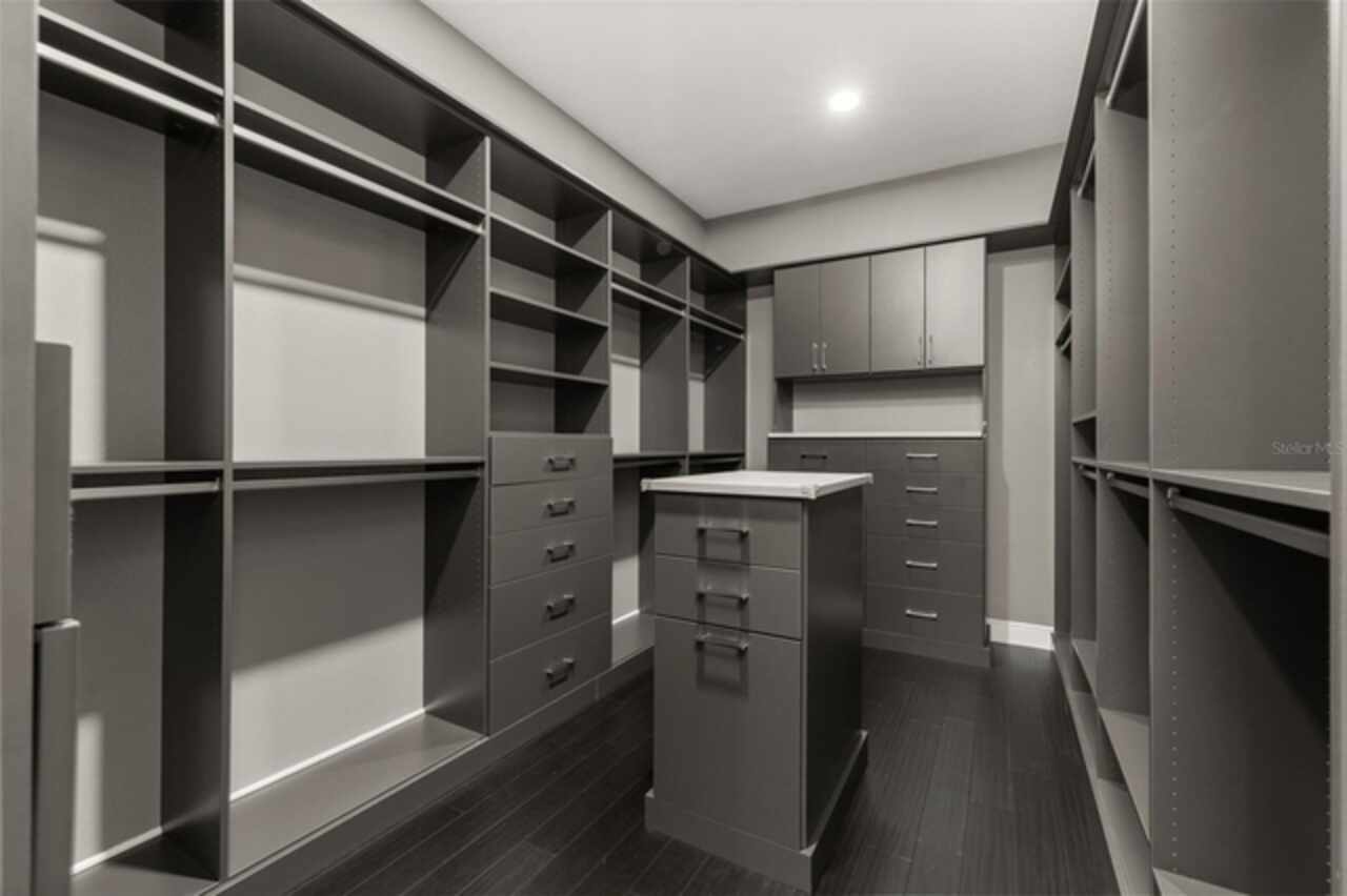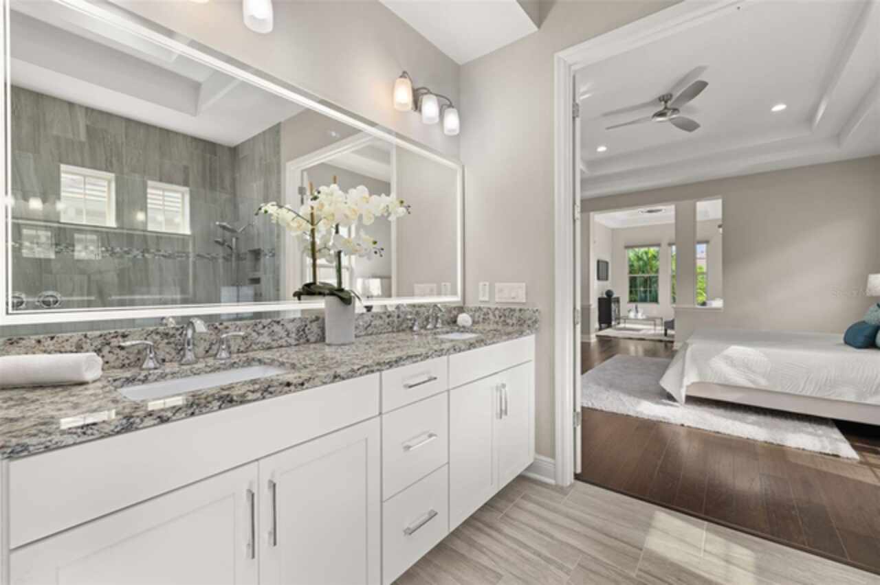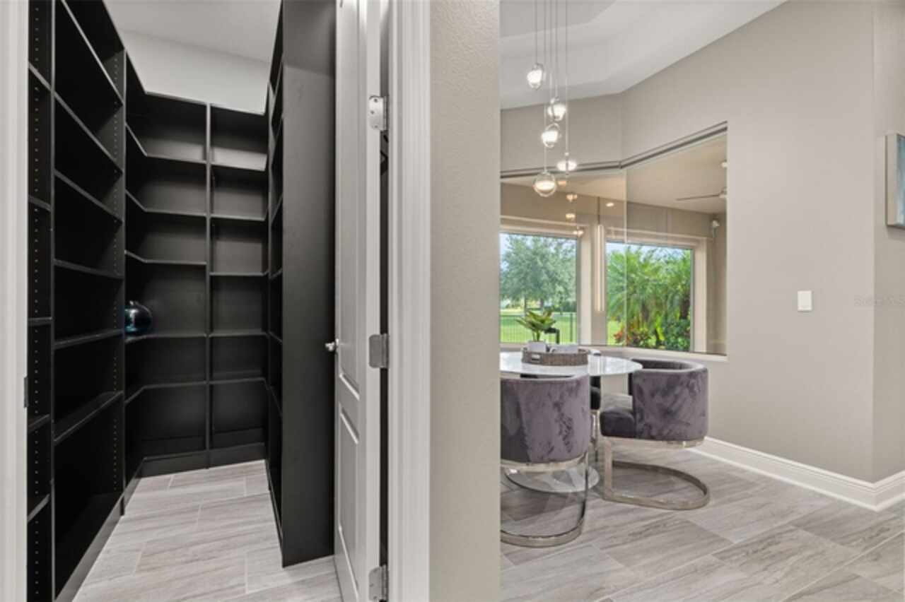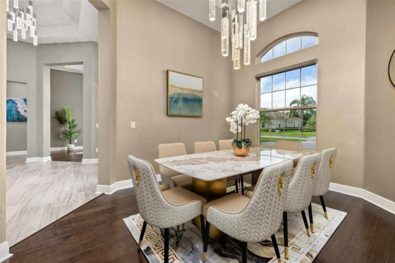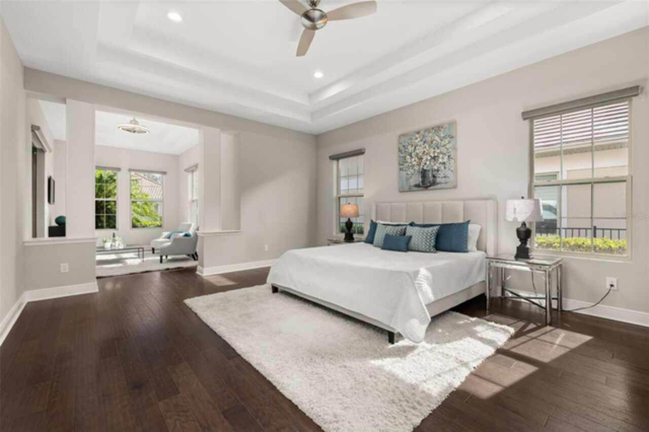 Under contract-accepting backup offers. Welcome to a truly exquisite single-story residence in the coveted and exclusive gated waterfront community of the Isles of Lake Hancock. Step inside to an opulent foyer that opens into a grand, light-filled living space with 14-foot double tray ceilings, engineered hardwood and luxury tile flooring, and expansive windows fitted with remote-controlled blinds. The open layout flows seamlessly through the formal dining room, dedicated office, and spacious living area. The chef’s kitchen is a standout centerpiece, thoughtfully designed with custom cabinetry, premium Monogram stainless steel appliances and an oversized pantry for additional storage. The private primary suite is positioned away from the secondary bedrooms and offers a peaceful retreat with an oversized spa-style bath, a luxurious walk-in shower, and a custom-designed closet. An extended den acts as the perfect reading nook or morning lounge, leading directly to your covered lanai and fenced backyard. Entertain in style with a high-end electric screen enclosure, outdoor heating unit, and custom entertainment cabinetry. The property also features dual garages—a two-car and a single-car—finished with sleek smoke grey epoxy flooring, providing flexible space for parking, a home gym, or elevated storage. The garage is equally impressive, showcasing smoke grey epoxy flooring, car lift capability, and a dedicated space prepped for an in-home golf simulator—perfect for golf enthusiasts. Beyond the home, residents enjoy direct access to two man-made lakes in a nationally recognized water-skiing community, known for hosting world-class tournaments annually. The location also offers close proximity to Walt Disney World, upscale golf courses, premier shopping and dining, and features a community playground, making it ideal for both recreation and family-friendly living. This artistically curated home is more than just a residence, it’s a statement in luxury, design, and lifestyle. Don’t miss your opportunity to own a rare gem in the exclusive community of the Isles of Lake Hancock.