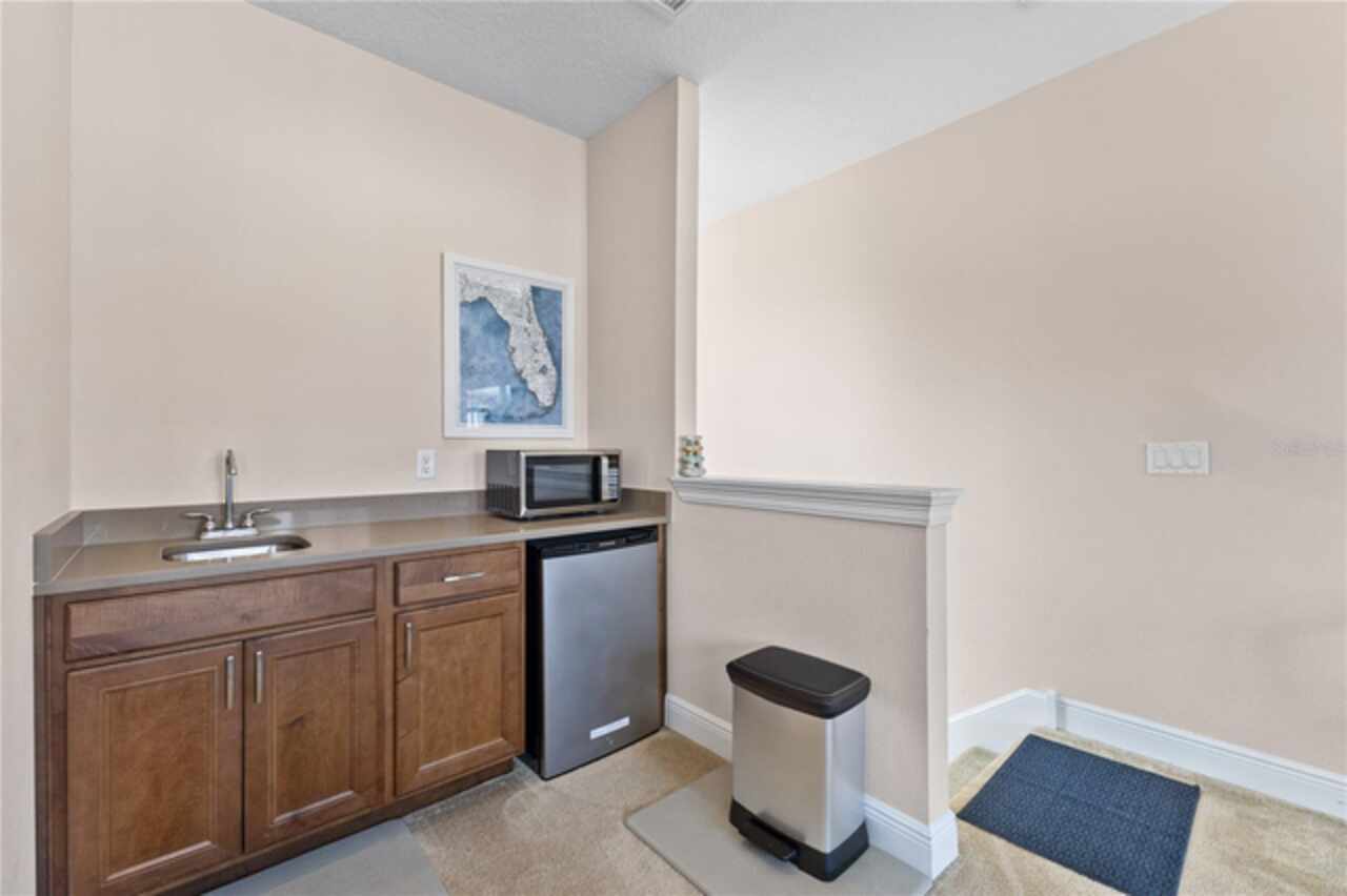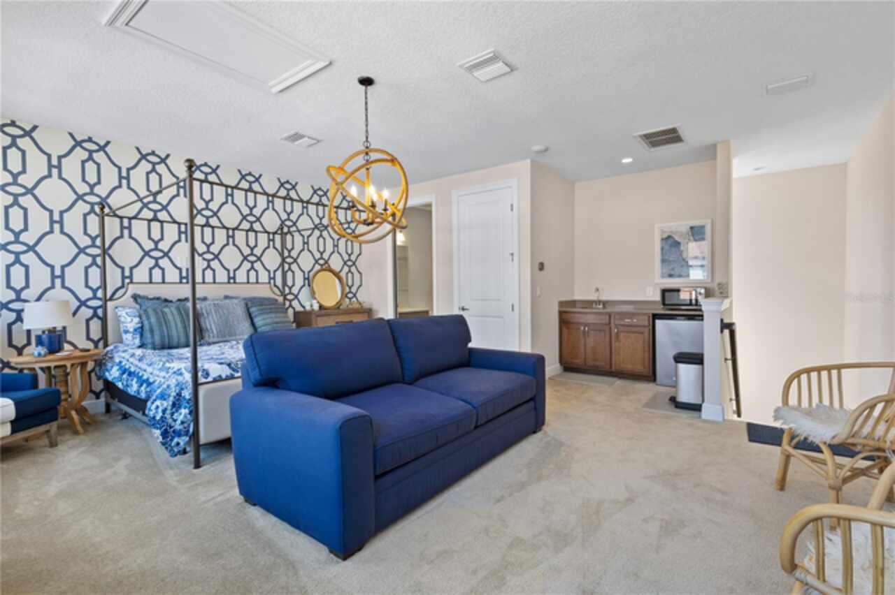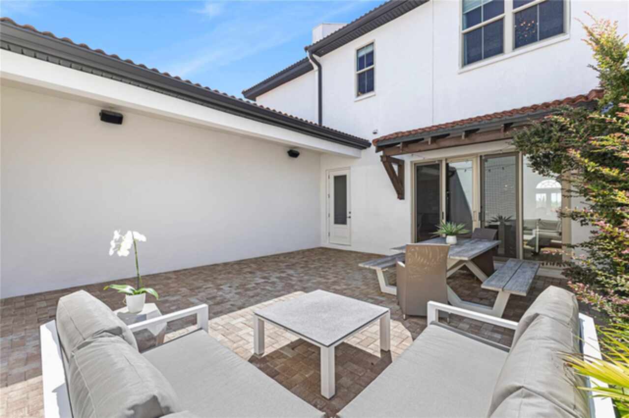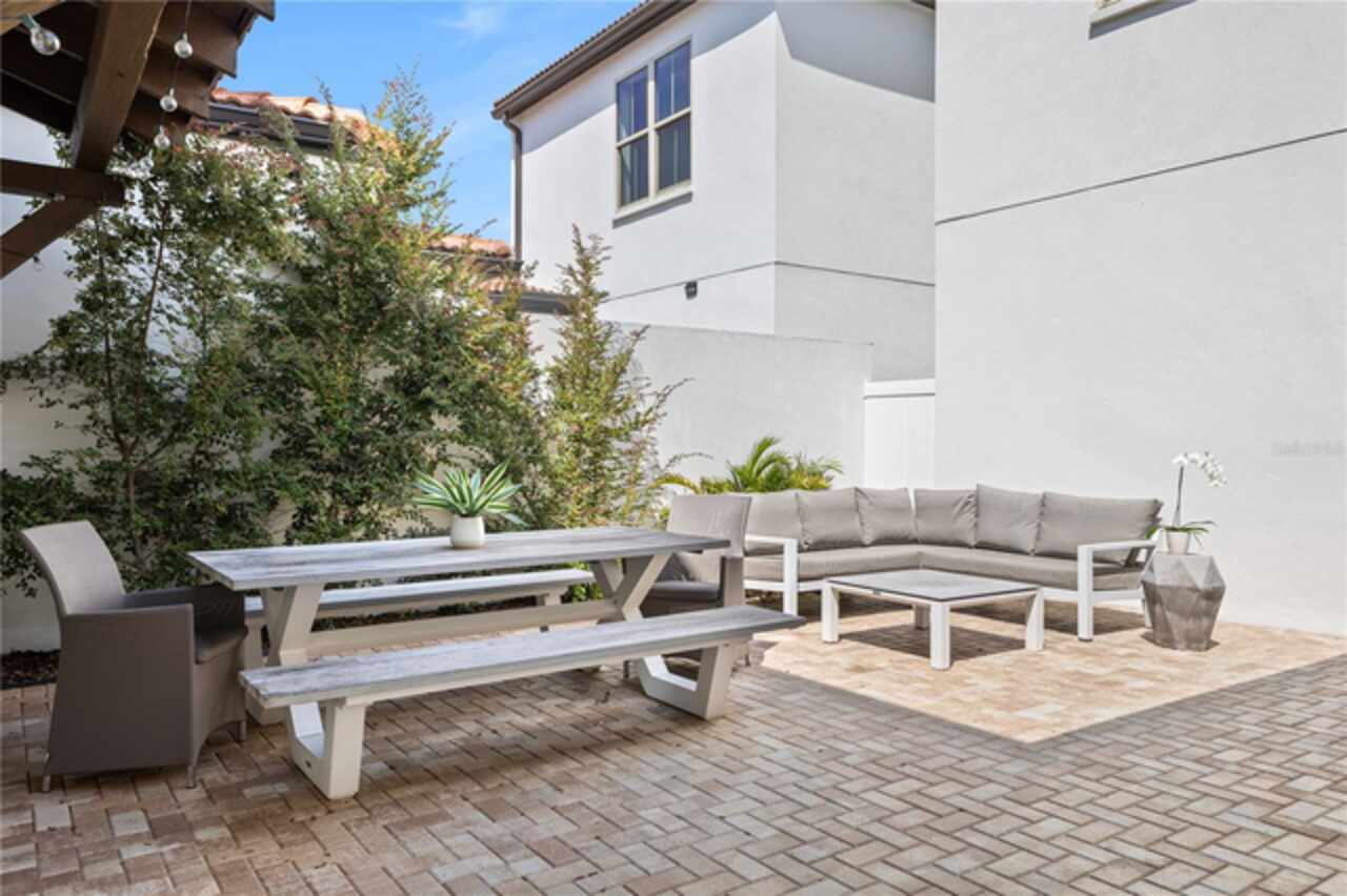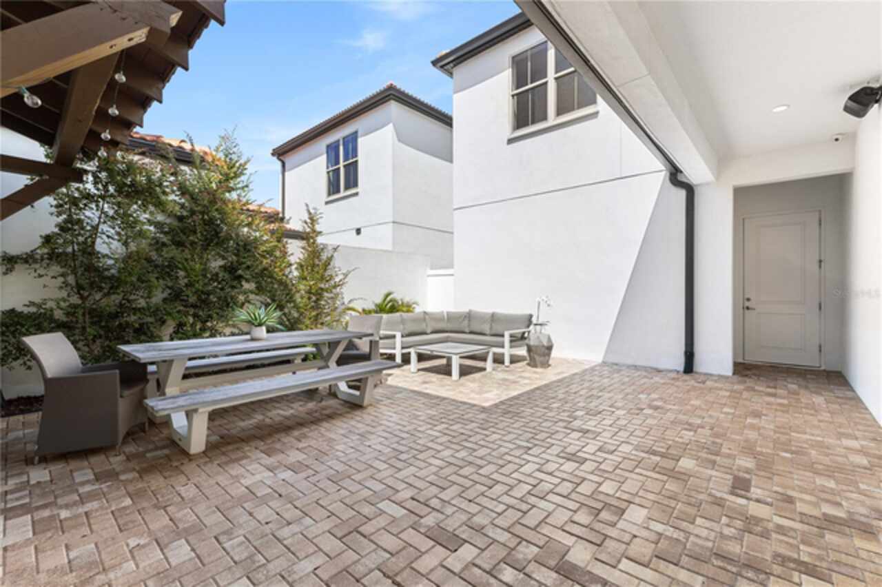 Welcome to this elegant and beautiful townhome, designed by an architect. This property is being offered for the first time since its original purchase in 2018. It has an open concept, full of upgrades and details. Wall papers bring a cozy atmosphere and elevate harmony. This home has ceiling speakers, security camera and ring door bell. As you walk in you feel the modern layout with a charming patio to enjoy family, friends and Florida weather. Main level with kitchen, 1/2 bath, living and dining area. At the living area you can enjoy the natural light, lovely crown-molding, blinds for privacy and Wine Refrigerator. Dining area with wall paper and Borserie. An extra graceful environment with wall paper at the 1/2 bath . Sophisticated gourmet kitchen with granite, backsplash, gray color cabinets, double sink and double kitchen island for extra seating. Sliding doors bring extra natural light and take you to back patio, blending space, nature and elegant paver to appreciate life. The upgraded stairs add a refined touch to the second floor with a cozy carpet. A spacious hall with nice double door closet for linens. Second floor Master Bedroom with wall paper at main wall, shade and walk in closet. Master Bathroom with 2 sinks, niche, shower inclosure, shower tiles upgraded to ceiling, private commode, and handheld private bided. Second floor tasteful 2 bedrooms, with wall paper, brand new custom closets, blinds and curtains. Second floor full bathroom with niche, shower enclosure, creme color stylish cabinet, 2 sinks and handheld toilet bidet. Laundry room with granite, cabinet and laundry sink. The surprise is the additional bonus apartment on top of garage with mini kitchen, full bathroom, wall paper at the main wall, blinds and walk in closet. To wrap this masterpiece listing, a 2 car garage with epoxy. This home was a vacation home for sellers, as they never lived, and only used for a few days during the year. Schedule a tour as you will fall in love!