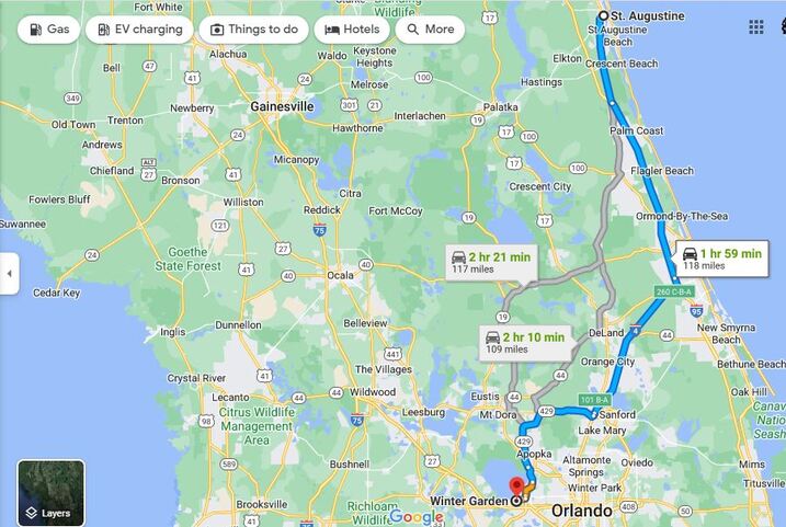 Explore the journey from Winter Garden to St. Augustine, with a distance of 94 miles and travel time of 7h 3m.